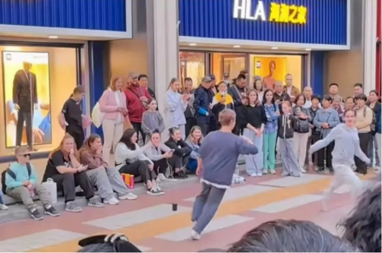 再看北京王府井,两个法国人跳舞,好家伙,一群法国人围观。