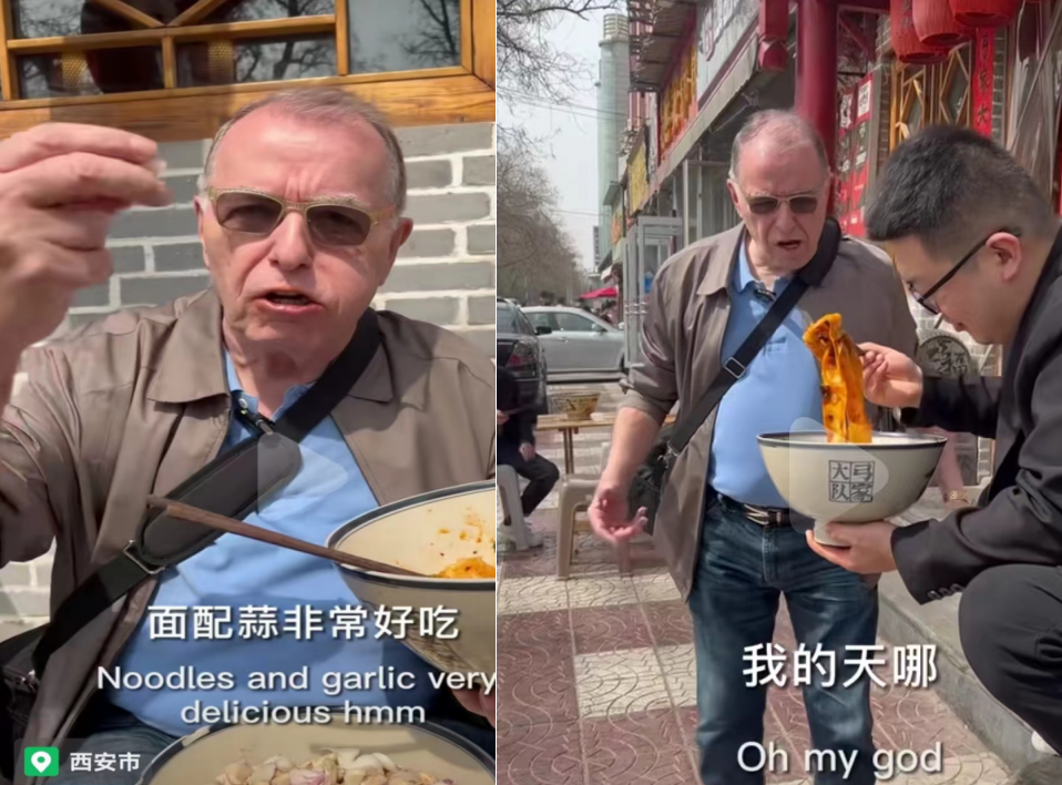 大碗面配大蒜,老外也能吃得津津有味,美食无国界,也是解锁了西安吃面精髓。