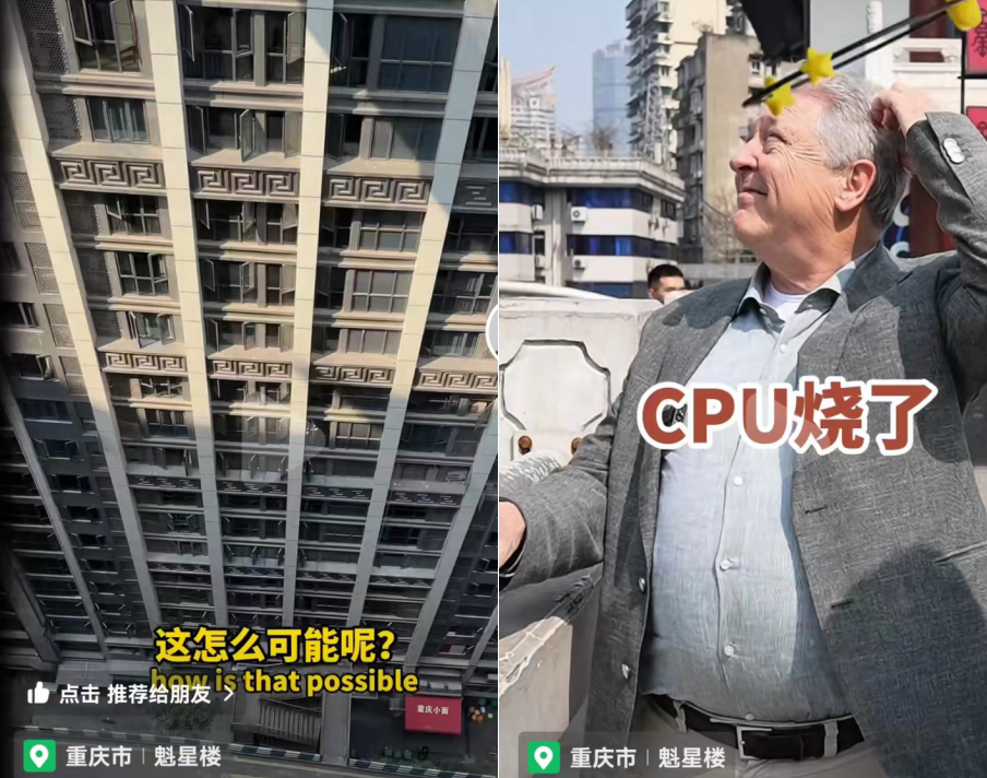 还有被山城重庆的8D魔幻建筑惊到的老外。有人说,不来重庆,不知道什么是“一楼”。