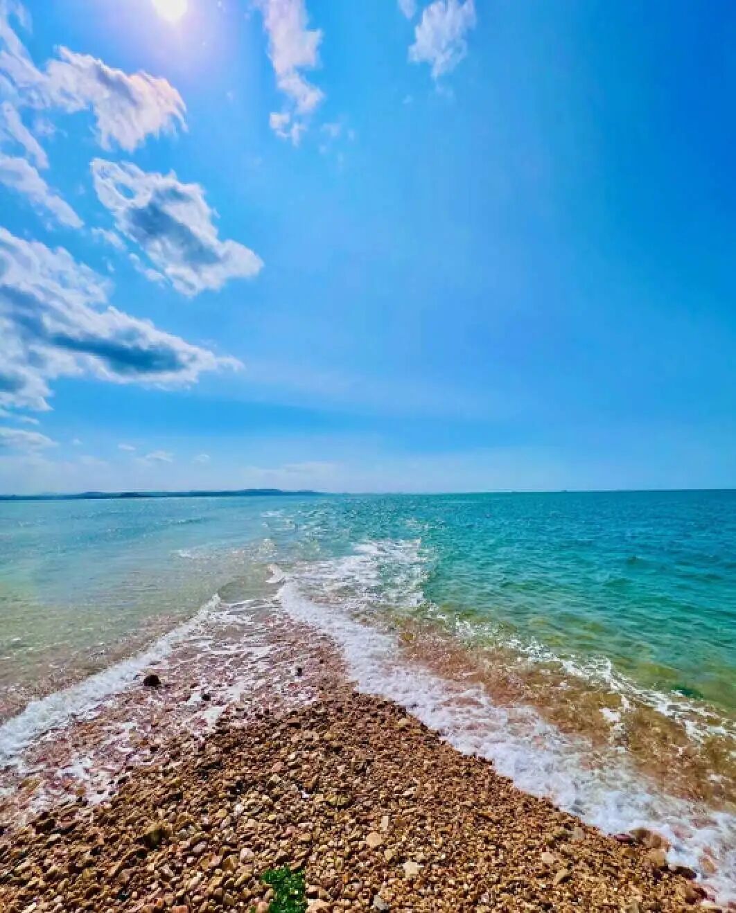 它由珠矶卵石堆砌而成,形态优美,酷似马尾,其拖尾长沙延伸至大海中央,将碧海一分为二,一边碧蓝,一边带着浅黄,而我可以站在黄海与渤海的分界线上,感受着蓝天碧海的绝美与神奇。