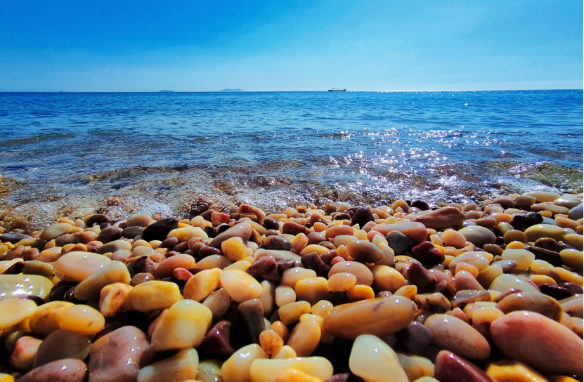 让人惊喜的是,砣矶岛的海滩并非由细腻的沙滩构成,而是由密密麻麻的鹅卵石铺成,这些彩石,以清新的青碧色为主,间或镶嵌着黄、黑、紫、白、绿等丰富的色彩,犹如大自然的调色盘。