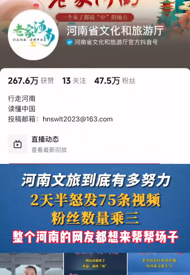 河南文旅2天半狂发75条视频,涨粉两倍;