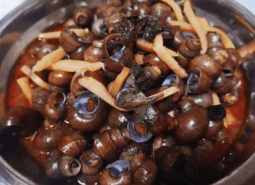 将田螺爆炒后,与酸笋、姜蒜、辣椒等慢火炖煮,酸辣鲜香,美味绝配。