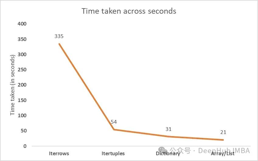 ' iterrows '函数在遍历DataFrame时显示出最高的时间消耗。与“iterrows”函数相比,使用“itertuples”函数可以使DataFrame迭代的速度提高6倍。在字典和数组上迭代被证明是最有效的方法,使用循环提供最快的迭代时间和最佳的数据操作。