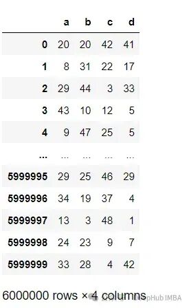 import numpy as np import pandas as pd df = pd.DataFrame(np.random.randint(0, 50, size=(6000000, 4)), columns=('a','b','c','d')) df.shape # (6000000, 5) df.head()