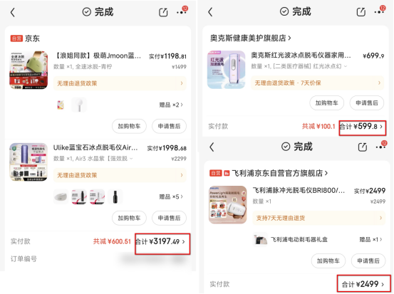 So,小Yoo斥“巨资”(6632.49元)拿下了某like、极M、飞利P、奥克S4款家用脱毛仪。然后还跑了2家医院和2家美容院!
