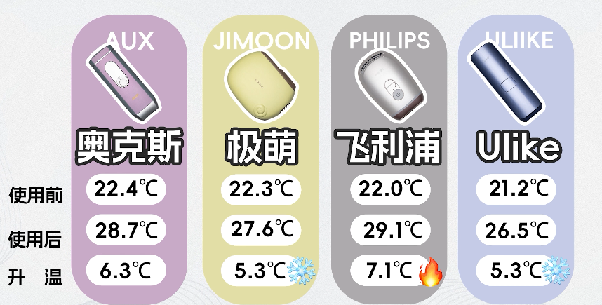 在经历15次击打之后,4台脱毛仪升温情况如下: