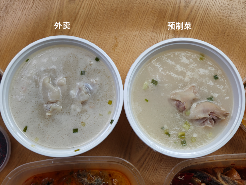 从卖相来看,不论是蛋花汤,还是蹄花汤,预制菜版都要更胜一筹。至少看起来,是色香味俱全的。(PS:无滤镜纯享版~)