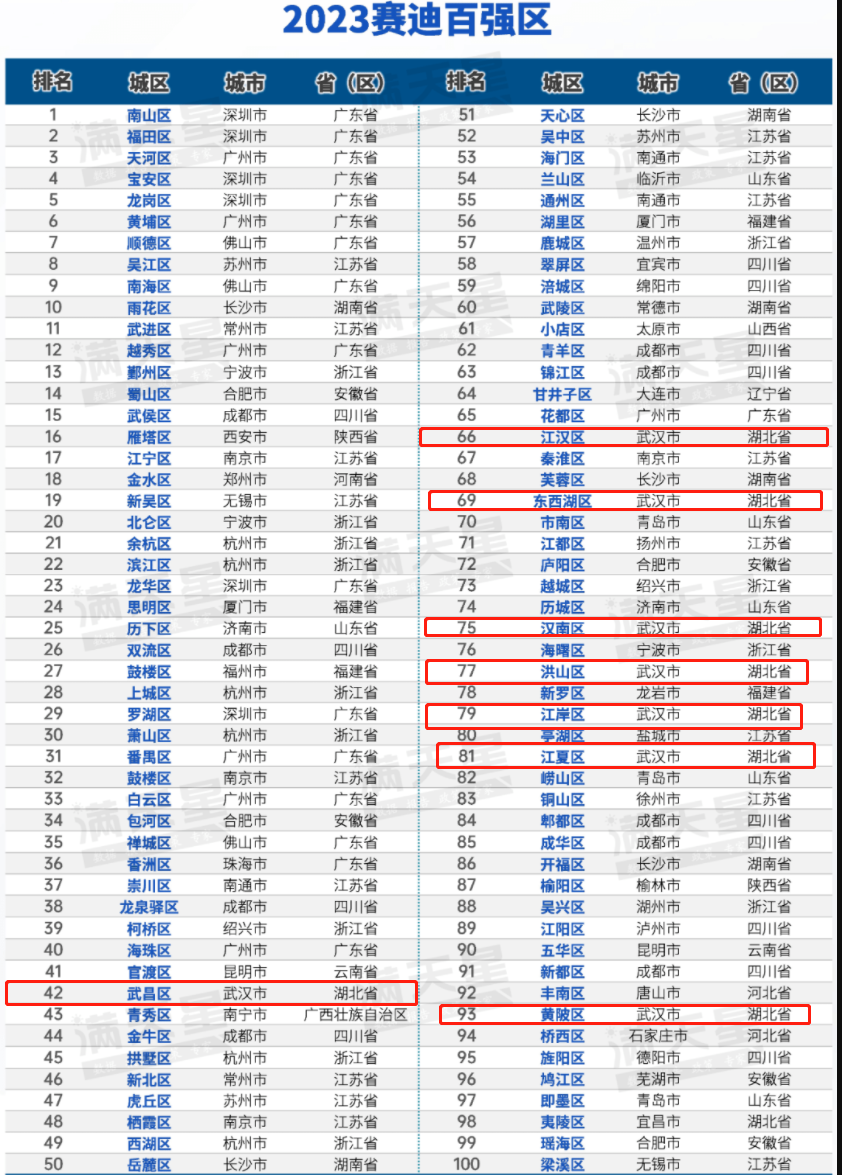那么武汉有哪些区上榜了,分别排多少名呢?