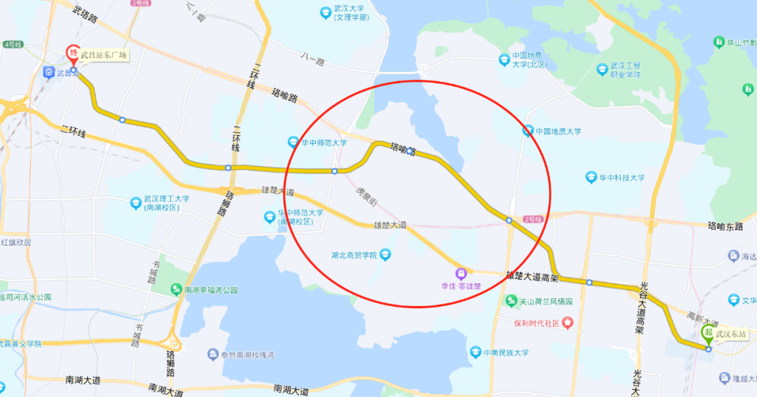 比如从11号线武汉东站过来,本来是沿着雄楚大道直走的,但是却在快到珞雄路交叉口的那个地方拐了个弯去了光谷广场。
