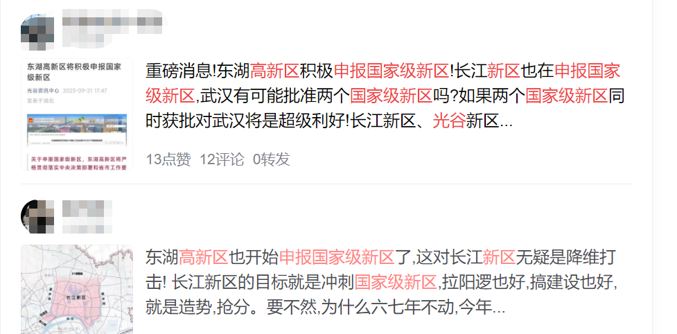 毕竟长江新区现在比光谷差远了,武汉又不可能同时获批两个国家级新区,谁能获批谁会淘汰一目了然。