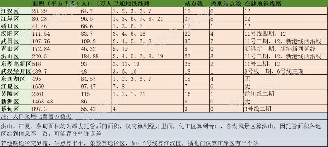 不同的是,江岸区面积小,换乘站点数全武汉第一,洪山区在建条数比较多,后期站点数会大幅度提升。