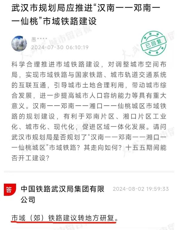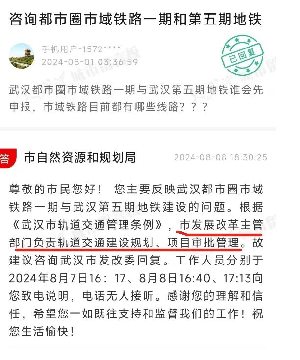 而武汉之前一直宣传的市域铁路目前也没有下文,当市民询问进展时,基本都在踢皮球,没有明确答复。