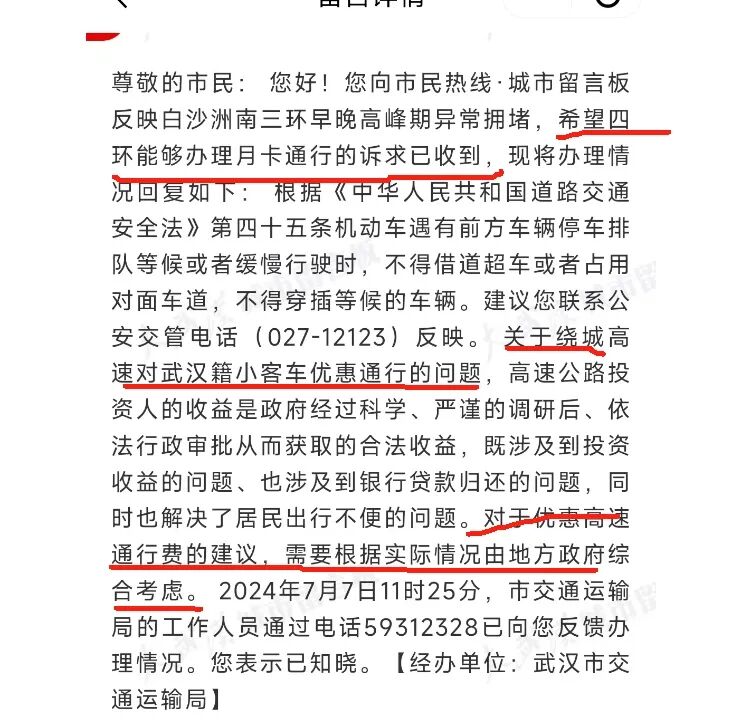 希望决策部门能够多听听民声,结合实际情况尽快研究相关优惠政策,提高四环线的利用率,促进各片区联动,壮大武汉!