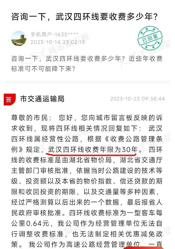 好巧不巧,武汉四环线属于经营性收费公路,武汉市交通管理局回复,四环线收费年限是30年!