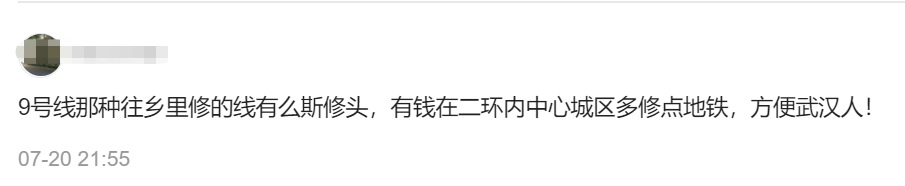 其实像这个网友的言论不在少数!很多人都觉得城区才应该修地铁,三环外都是乡里没啥人不应该修地铁,还说武汉通往三环外的地铁都是运凳子。