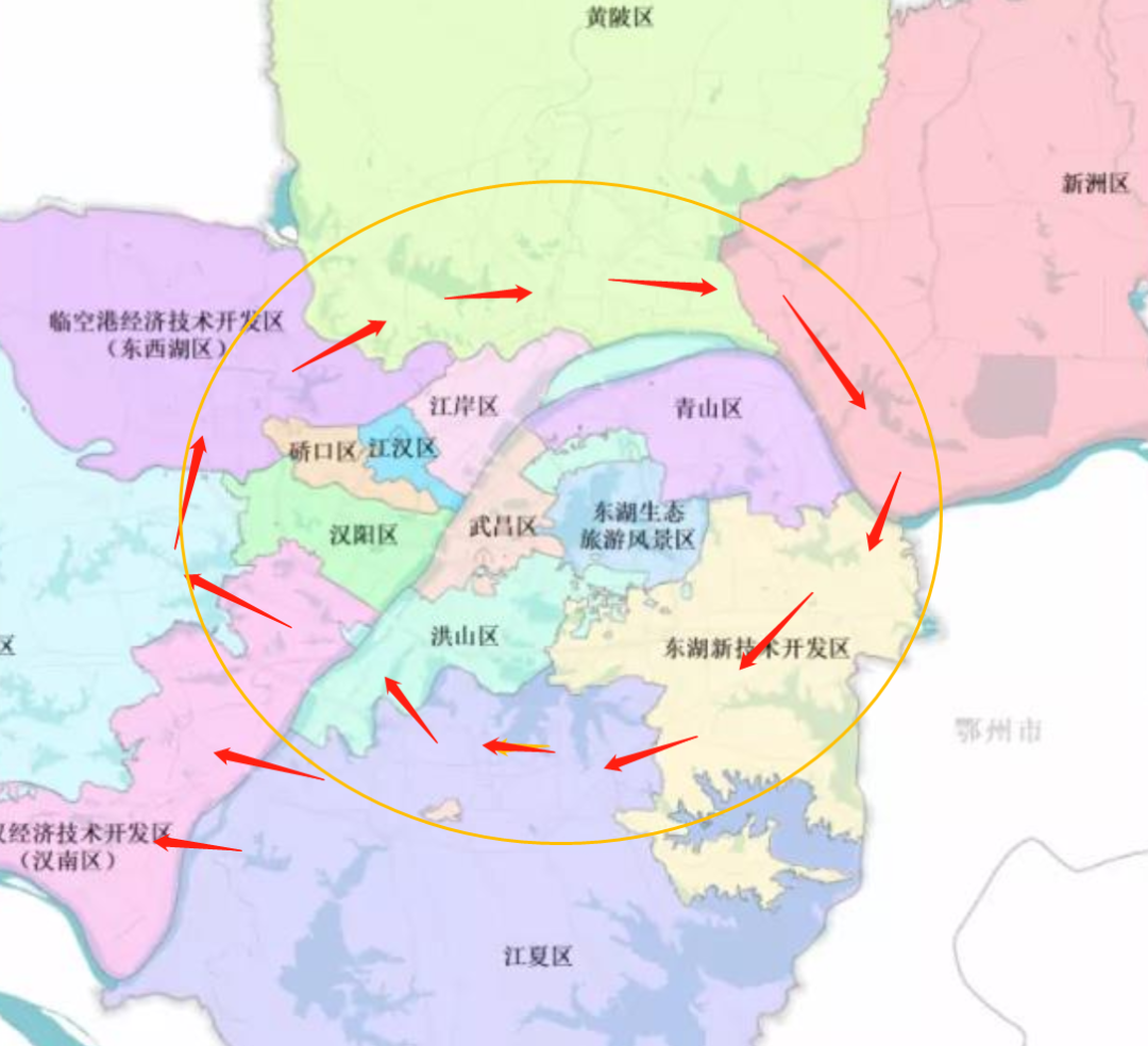 因此武汉必须要改变以往四大副城以点带面的发展思路,而是布局一条产业环线。