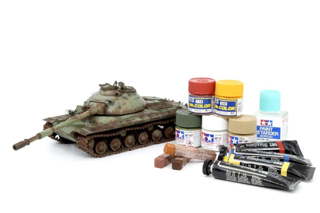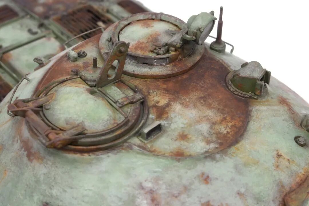 锈色郡士油漆打底,普普通通的操作,真正有趣的地方是,作者为了废弃坦克斑驳的漆面效果,采用了手涂主.当然哈,手涂完还用稍微深一些的颜色(xf67+xf1)勾勒了一下轮廓,同时用油漆(114+109)加强了下锈色,最后用油画颜料调出多个深锈色先浅后深加强了锈蚀效果~