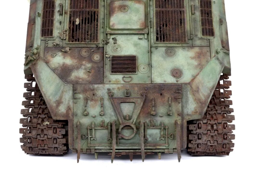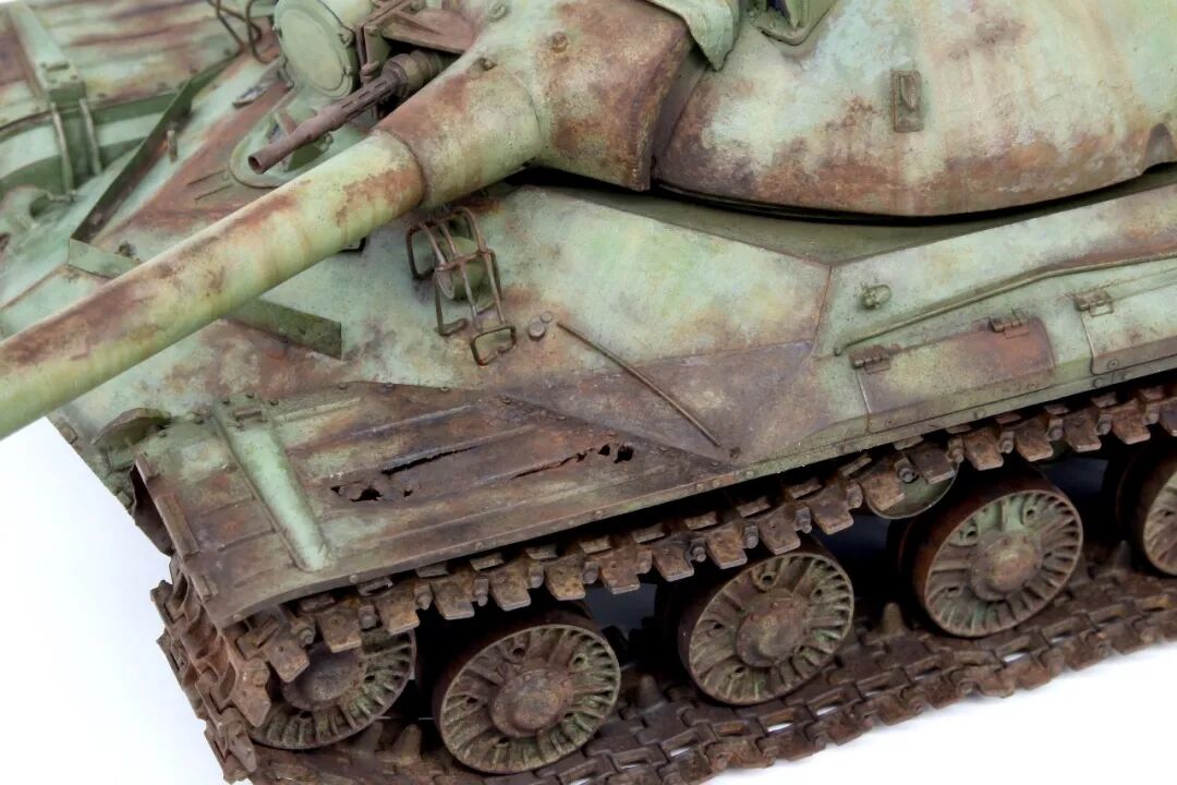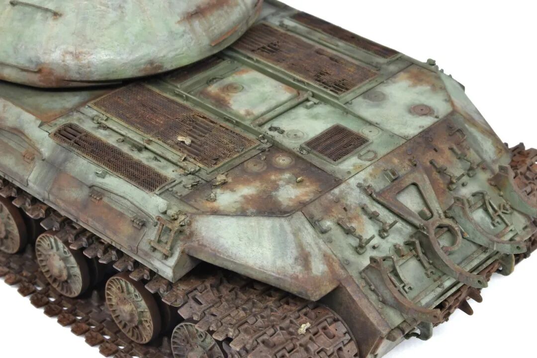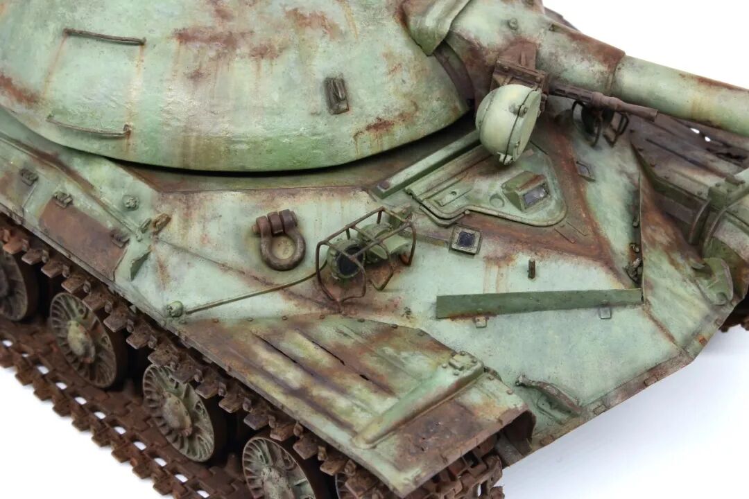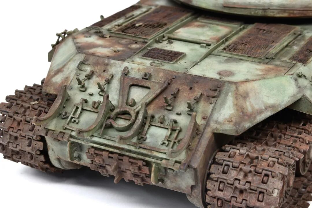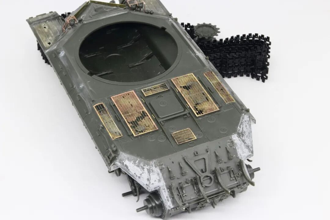 今天的主角是meng 的T-10,很不错的板子,作者自己用铜丝搭了灯架,把翼子板磨薄做了破损,把手换铜丝,这几样不是很复杂的操作,相信大家都了解,有趣的是蚀刻片的破损,往常大家都是那镊子、钳子搞啊搞,作者这个就厉害了,自己买了蚀刻粉兑水腐蚀的,效果柔和,比起镊子、钳子之流,小编感觉这样的效果更适合常年废弃的效果~