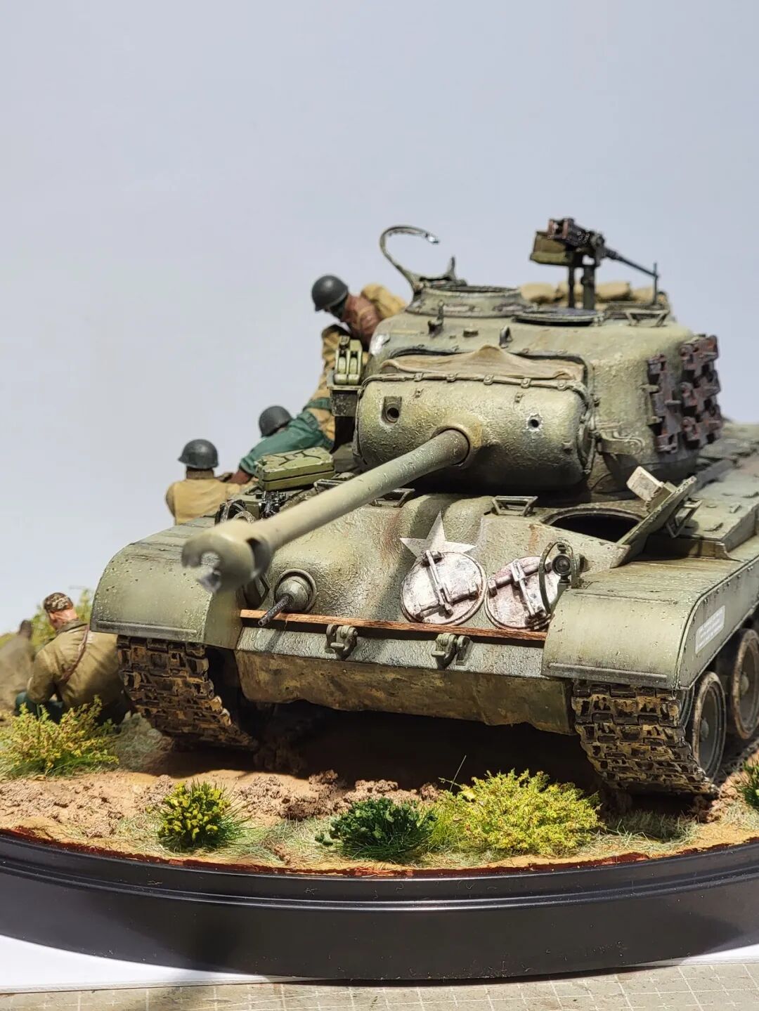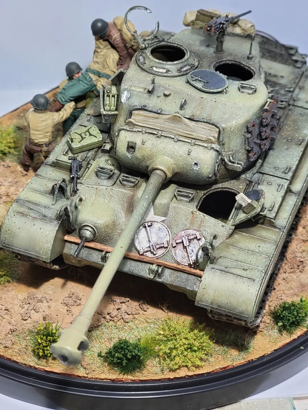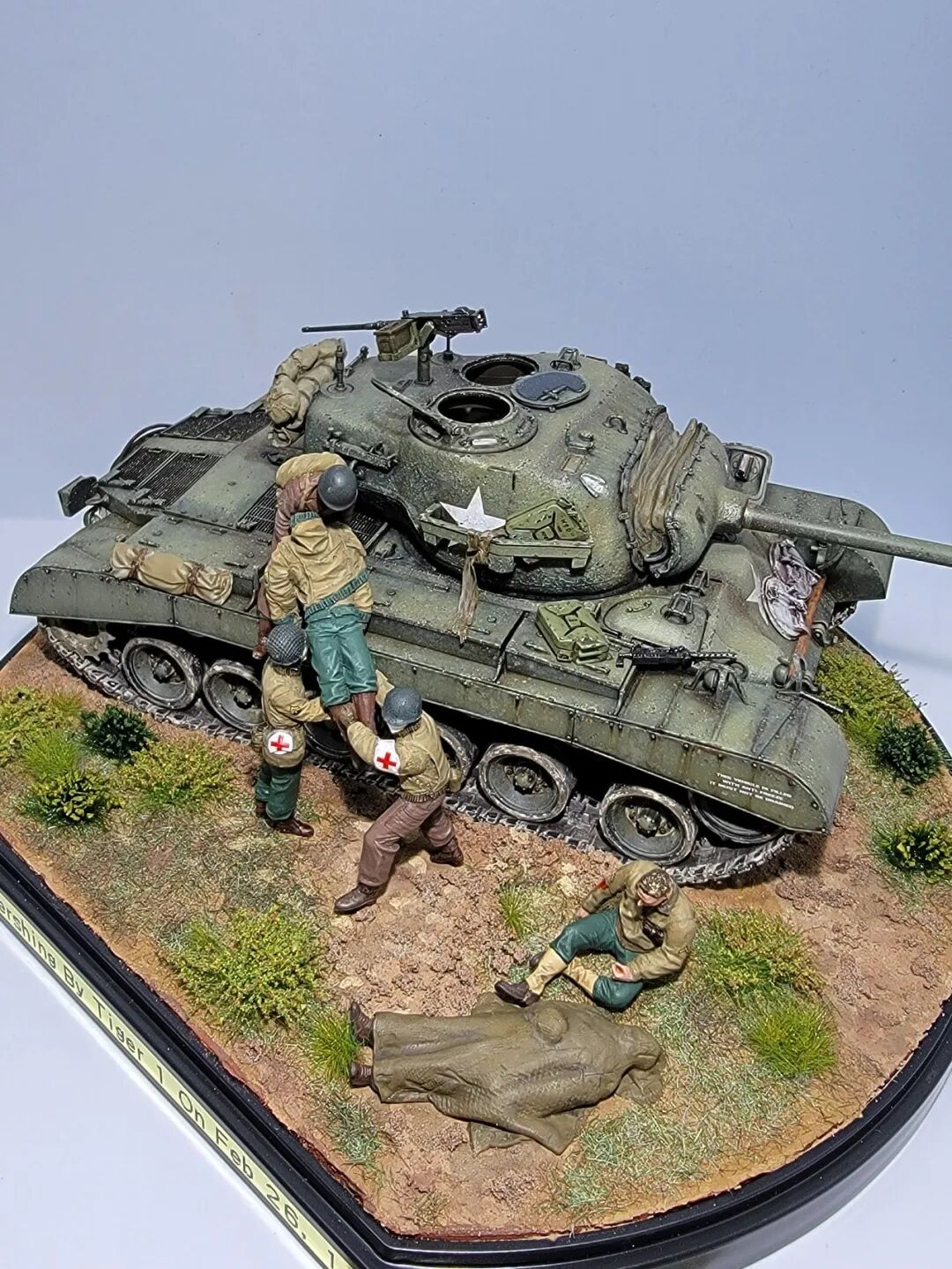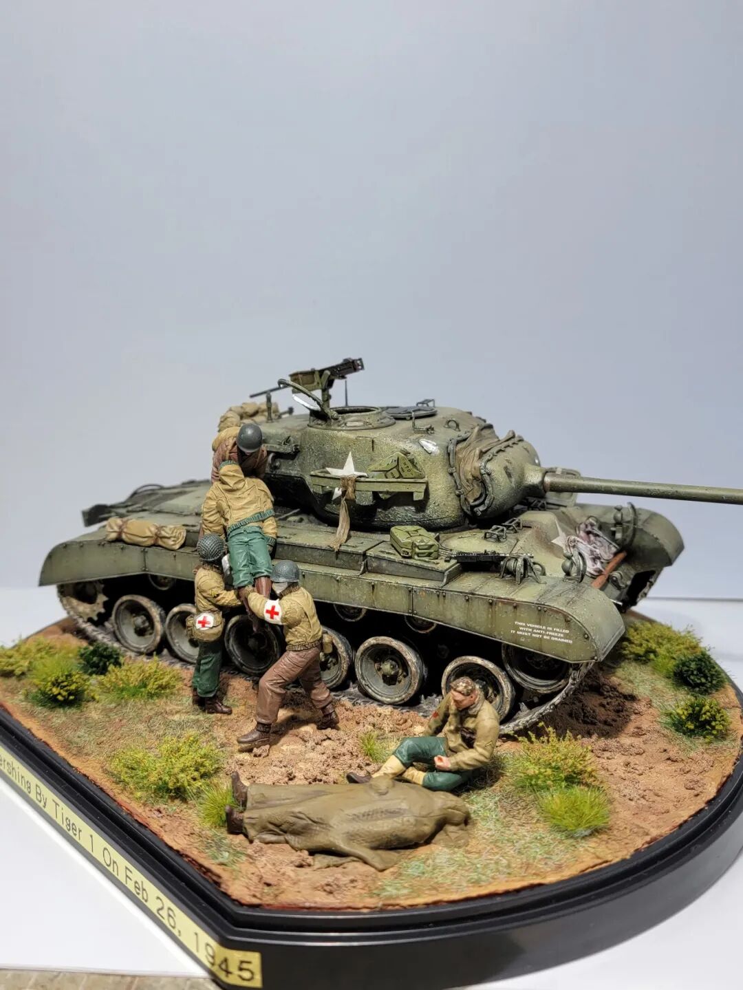 作者这次的小景是还原的一场真是战斗,当年一辆代号为火球的潘兴坦克被虎式坦克击毁,虎式坦克开了三炮,均击中了这辆潘兴坦克,一炮直接命中坦克的制退器,导致炮管损坏无法还击,剩下的两炮,一发打中车长指挥塔,另一炮击中了炮盾上的同轴机枪口,两名成员战死。不过这款新车在挨了3炮之后,行动装置并未受损,在两周之后再次投入战场!