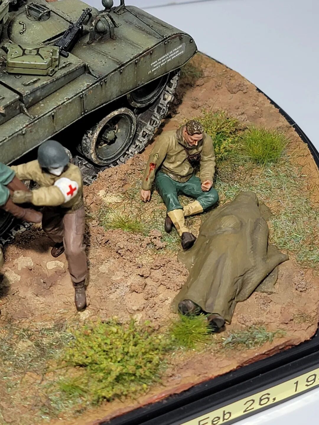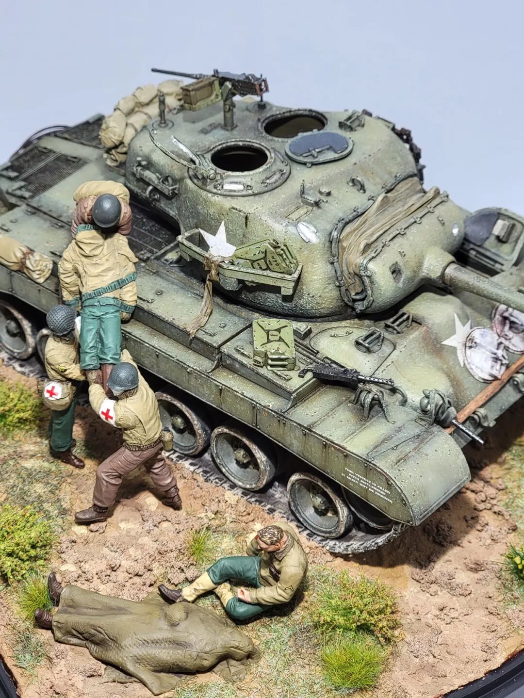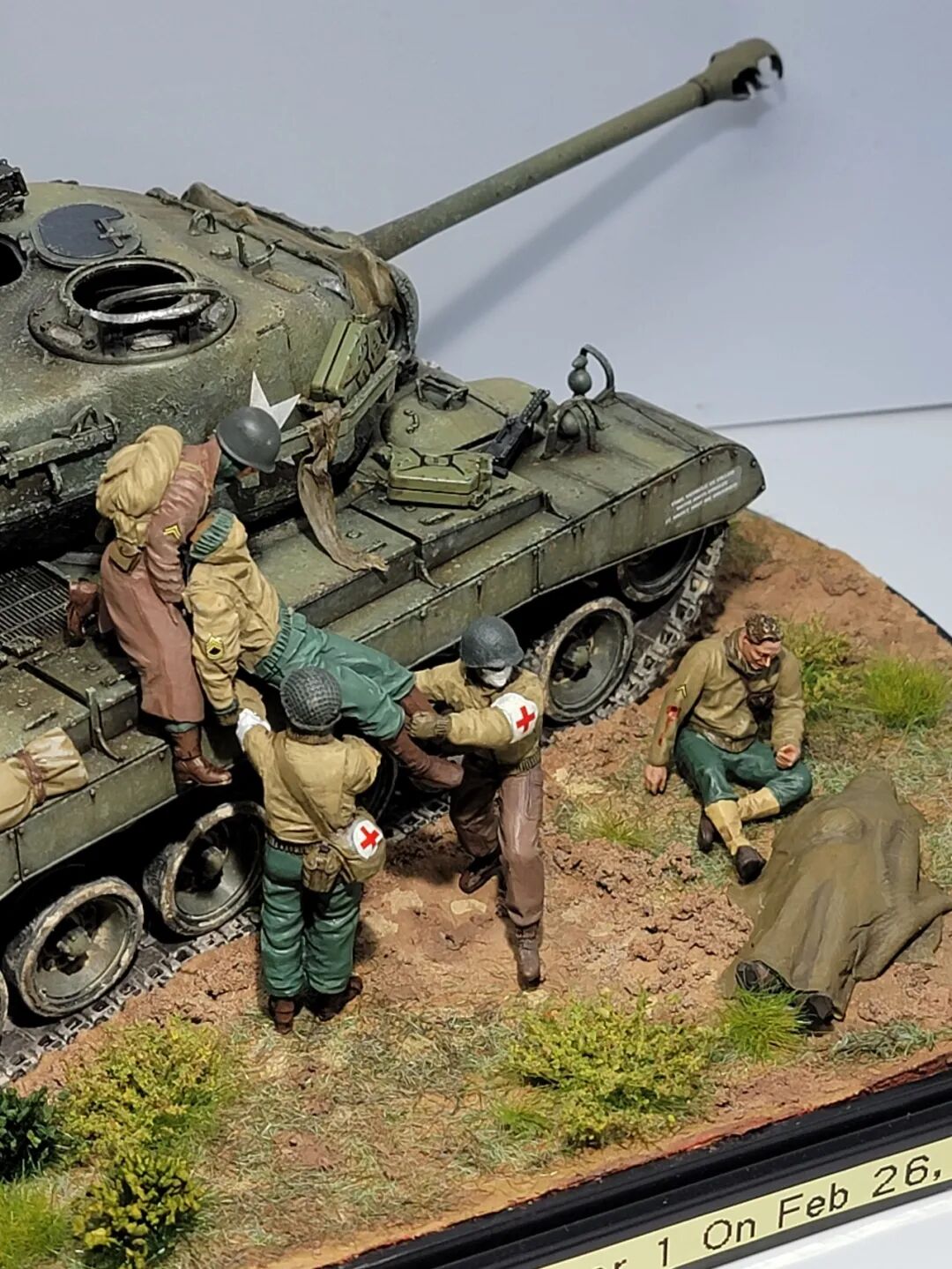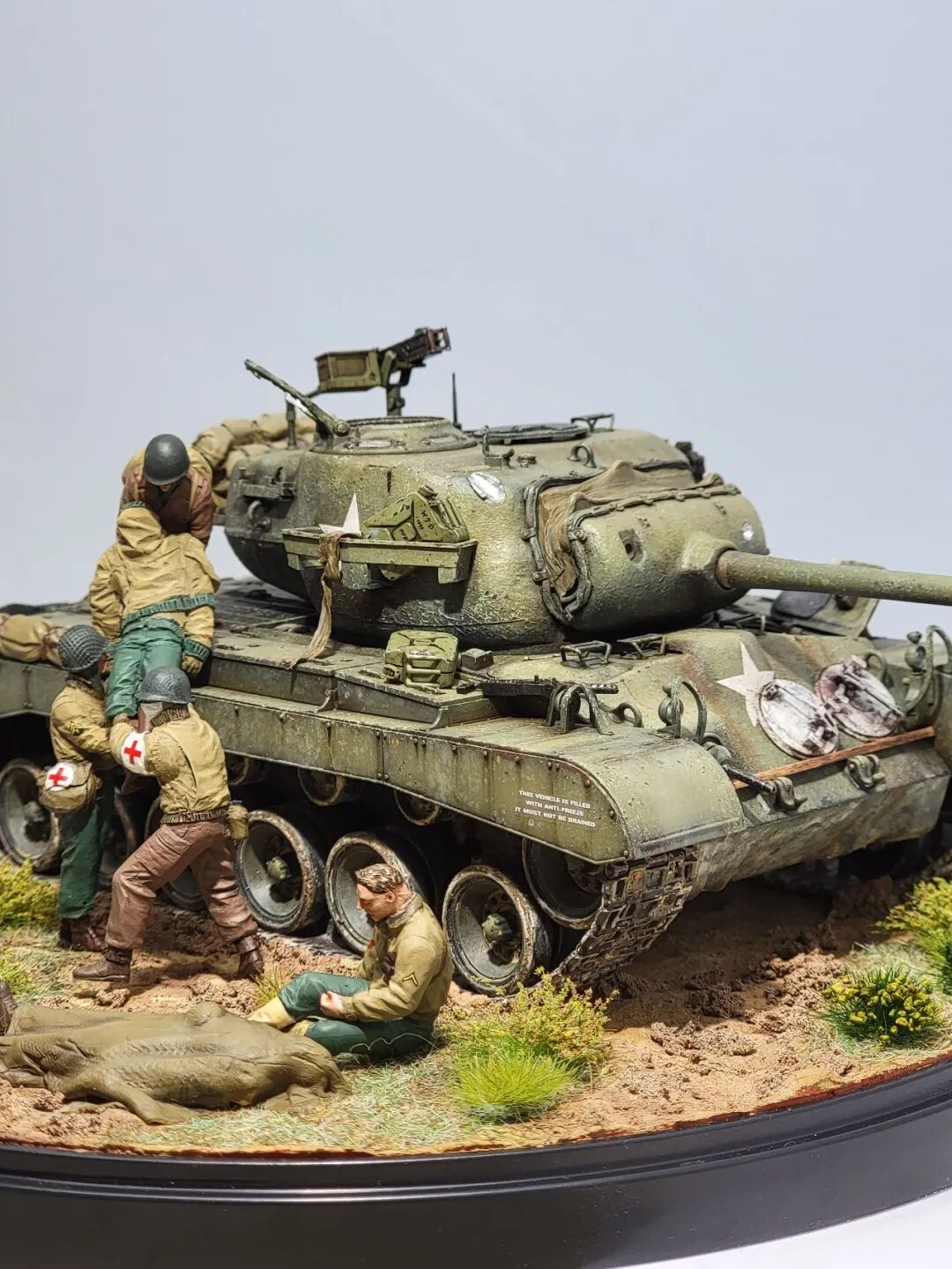 作者这次的小景是还原的一场真是战斗,当年一辆代号为火球的潘兴坦克被虎式坦克击毁,虎式坦克开了三炮,均击中了这辆潘兴坦克,一炮直接命中坦克的制退器,导致炮管损坏无法还击,剩下的两炮,一发打中车长指挥塔,另一炮击中了炮盾上的同轴机枪口,两名成员战死。不过这款新车在挨了3炮之后,行动装置并未受损,在两周之后再次投入战场!