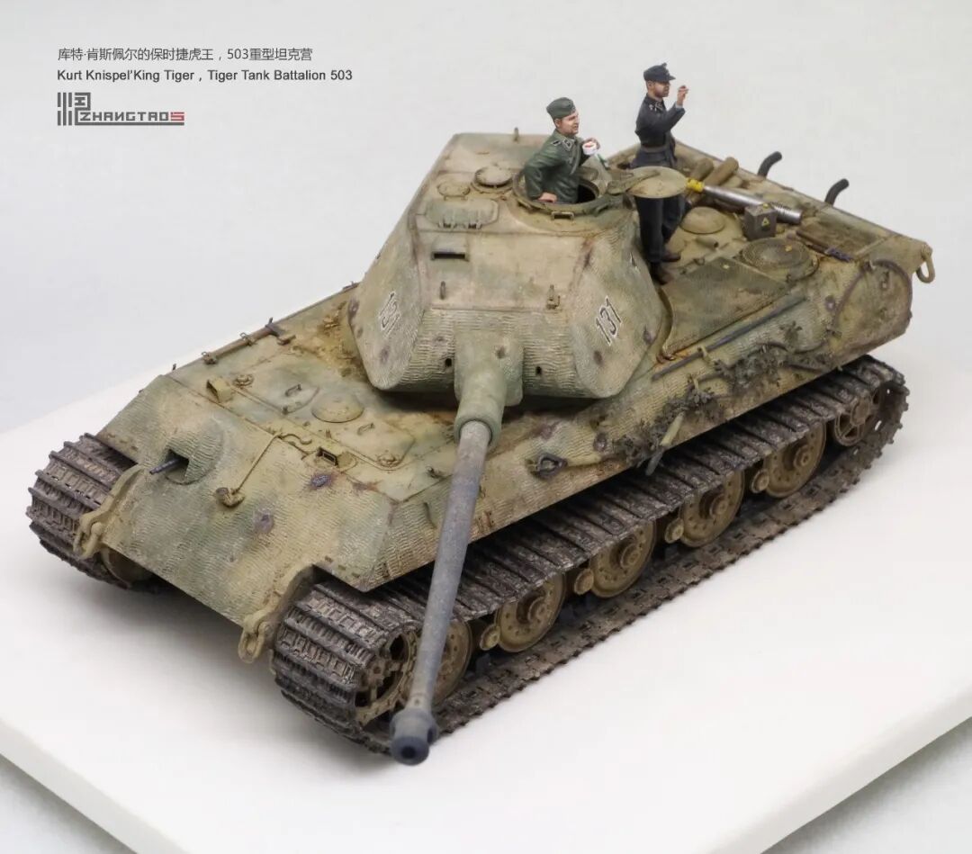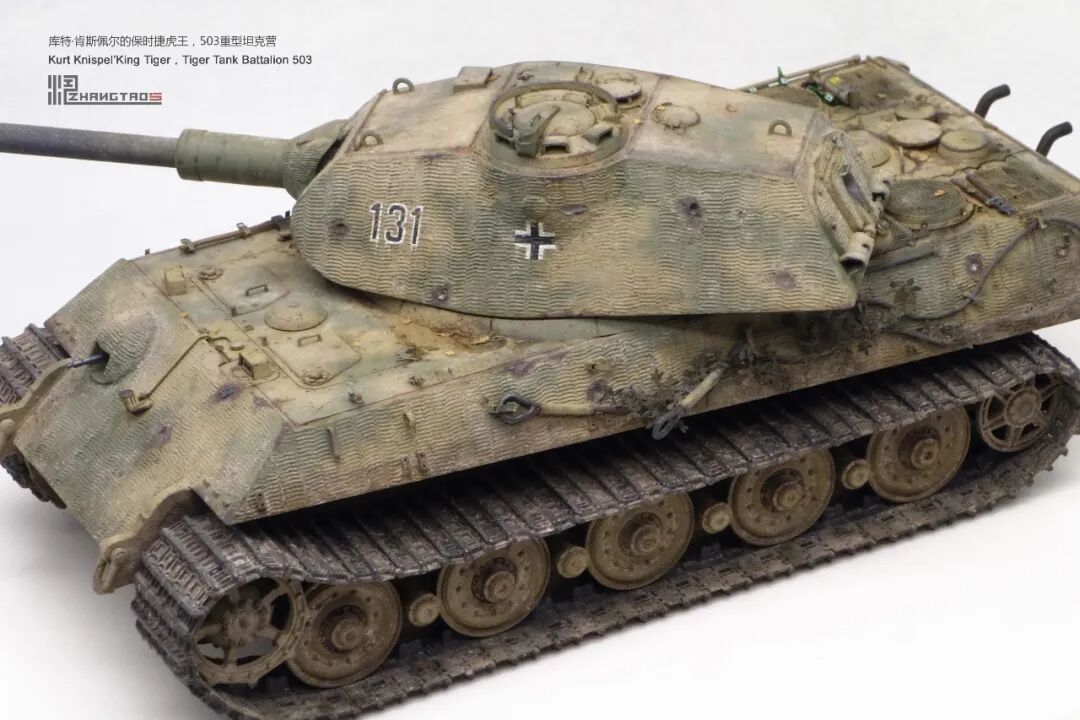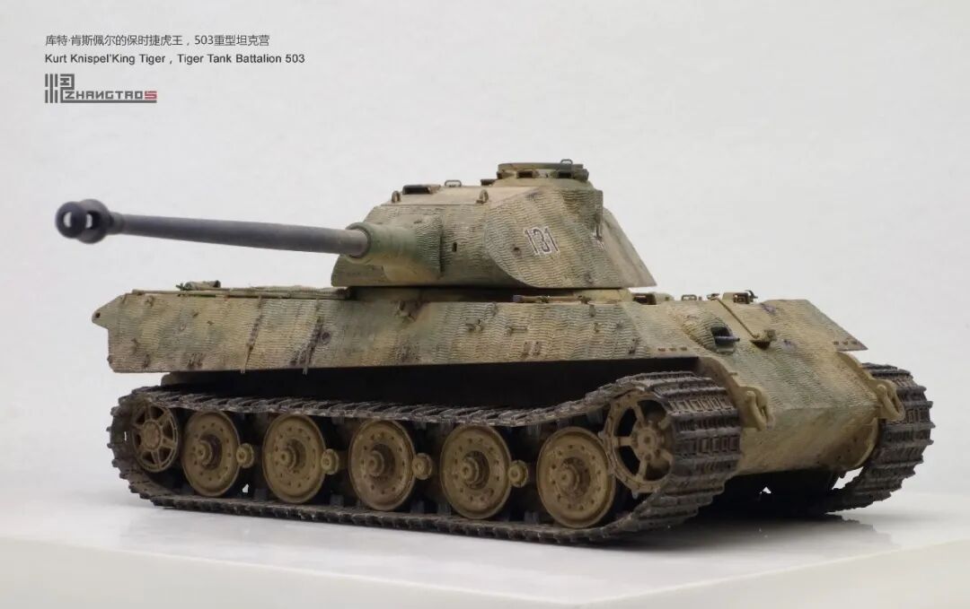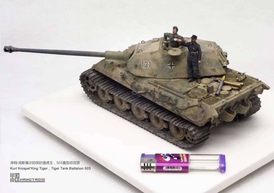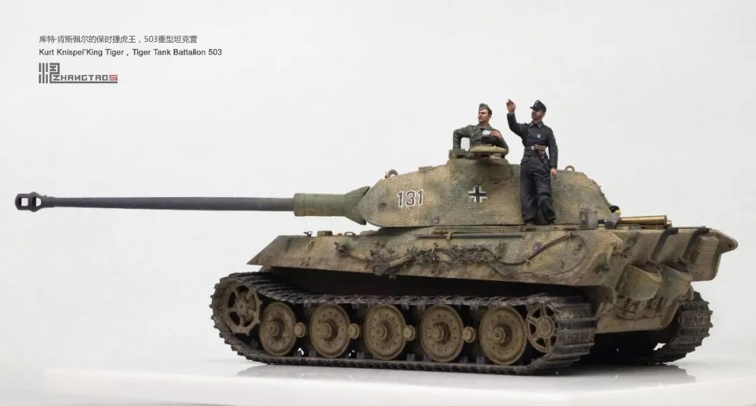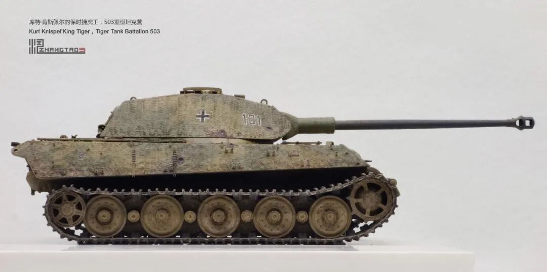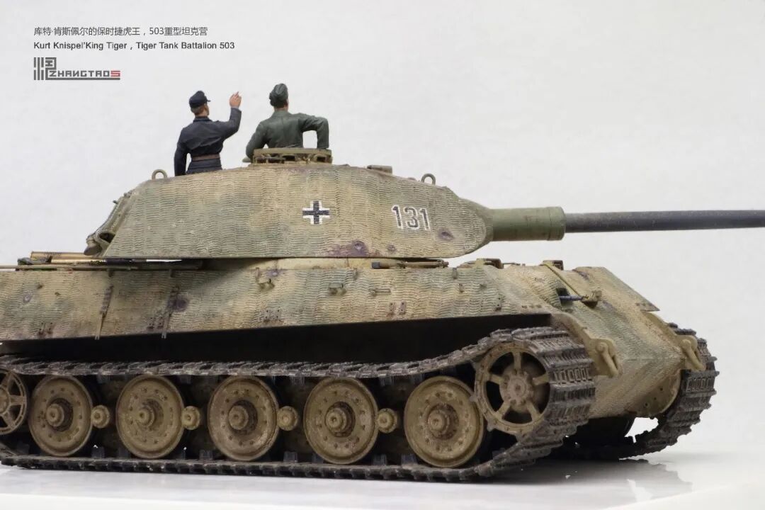 503营拥有众多狠角色,其中包括富有争议的最强炮手库特·肯斯佩尔,据说他的战绩可能超过195辆坦克,不过大部分成绩是作为炮手取得的,战争结束前这位王牌葬身于匈牙利苏军坦克的围殴中。这辆保时捷虎王就是他的131号,当时他还是炮手。虽然不算考证派,但也尽量找了503营西线时期相关资料,无奈关于这个王牌炮手的资料实在有限,只能“合理”制作了。