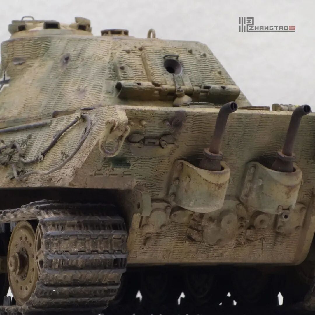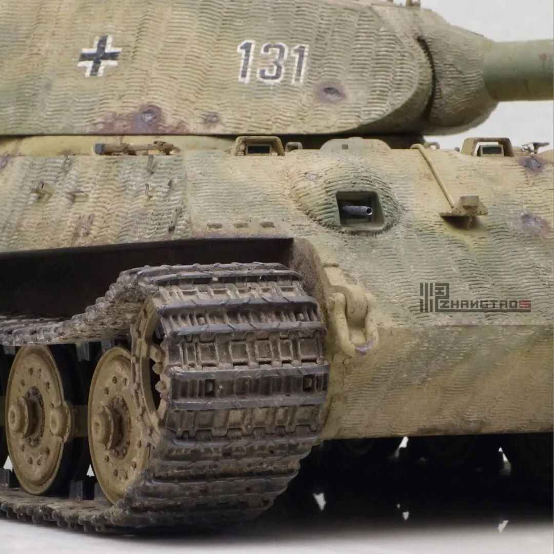 板件为meng的虎王,无奈friulmodel的金属履带太沉,会微显“八”字,所以放弃了,换成meng的活动履带就ok了。模型板件钢板纹理非常舒服,可惜大部分被防磁盖上了,全车上了蚀刻片和3D打印钢缆固定扣,保时捷虎王的炮管是有曲线的,换成威龙的塑料炮管(无奈我这盒meng的塑料炮管有变形),比套件里平直的金属炮管更真实。修改了meng虎王底盘“架高”的问题,模型其他方面都很好。