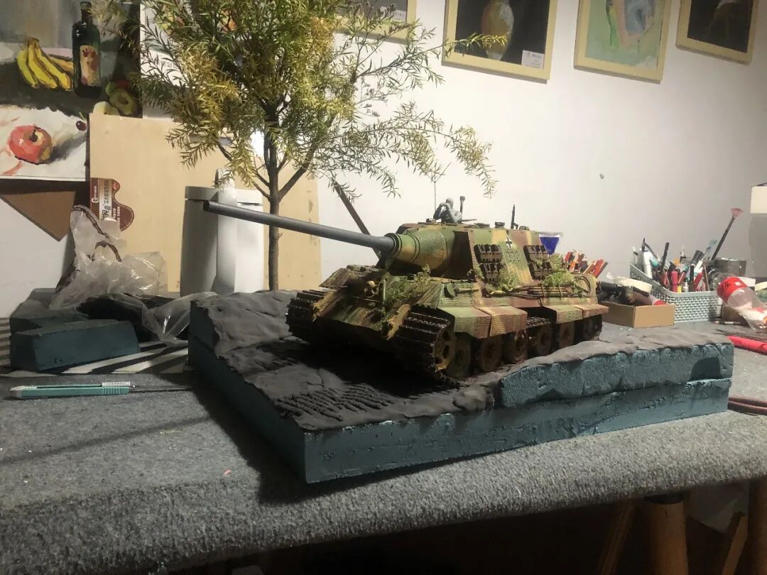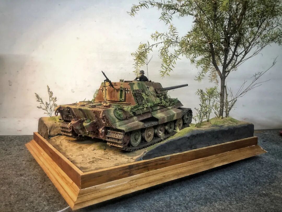 这款猎虎用的是徐工出品的全金属坦克,重量感十足,做好后还加了个底座,虽然是RC遥控的,平时不玩的时候也可以摆着当静态的。
