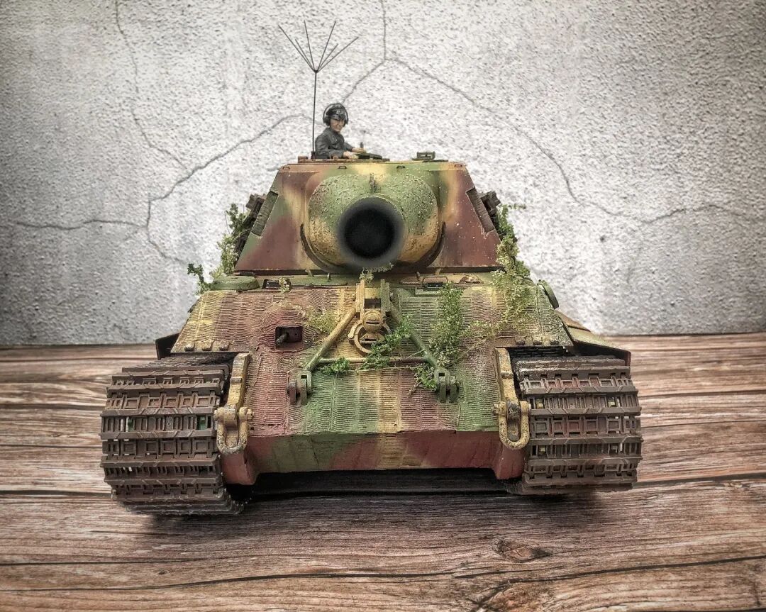 从外观看,“猎虎”坦克歼击车和“虎”II坦克区别很大。“猎虎”坦克歼击车个头更大,火炮口径也大,侧装甲板一直延伸到车体顶部构成其炮塔体的一部分,火炮的防盾也显得硕大无比。