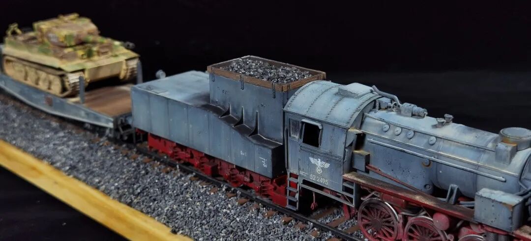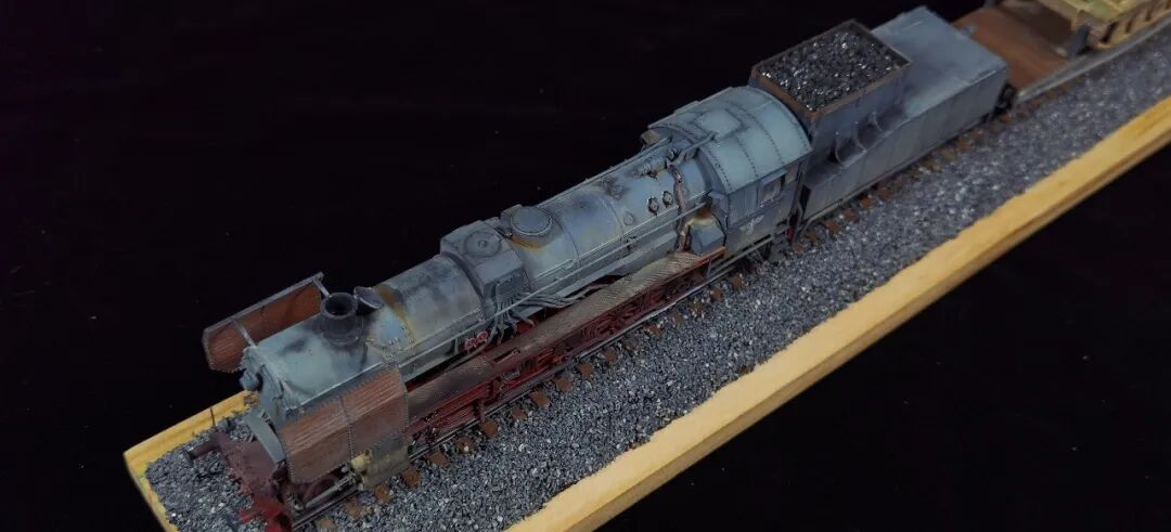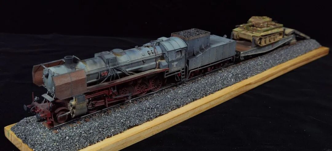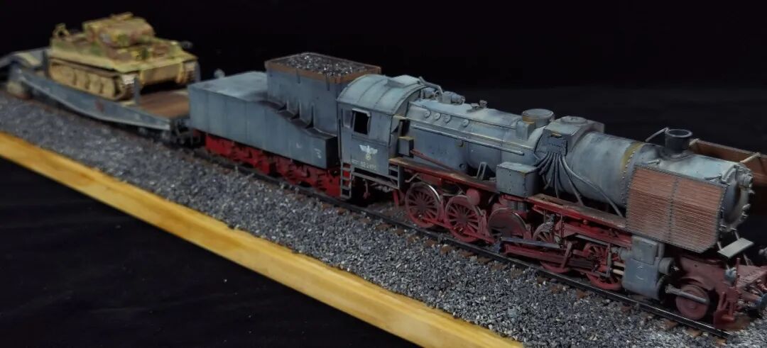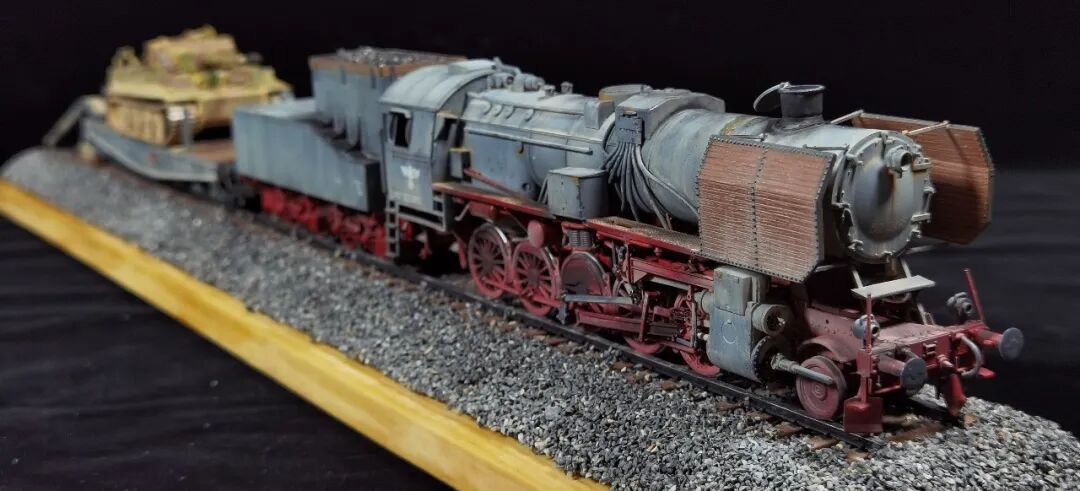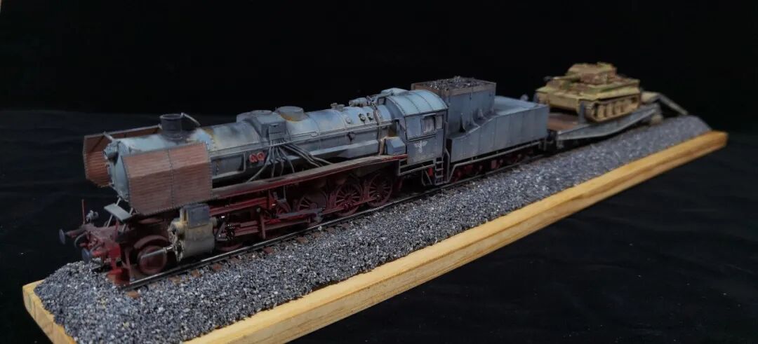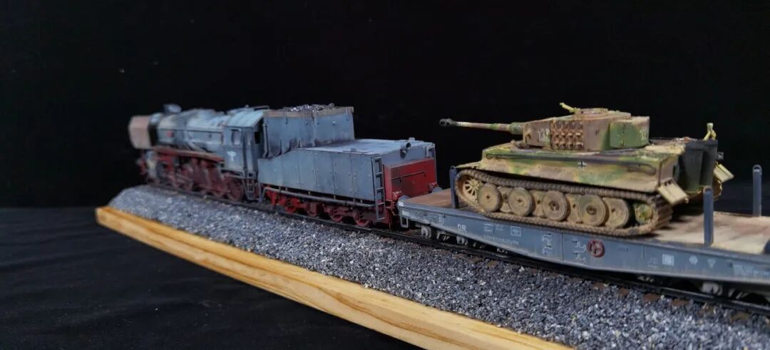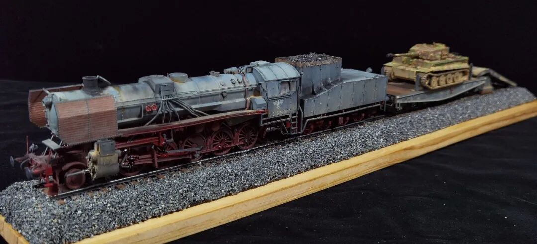 这一次做的是小号手72比例的二战德国“战争机车”BR52蒸汽火车+80吨拖车配虎式。BR52型蒸汽机车是德意志帝国铁路(DRG)在二战期间大量制造的一种轴式为2-10-0的蒸汽机车,是一种“战争机车”,两盒板件呢其实是毫无关联的,最后被我强行接在一起,脑补背景为:二战末期,德国把重型装备回送至柏林做最后的抵抗。路基的石子是刷的乳胶然后撒一层1mm左右的石子,质感意外的不错而且乳胶干了之后路基完全硬化也方便运输。
