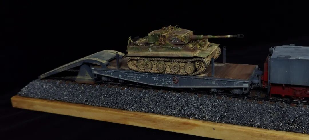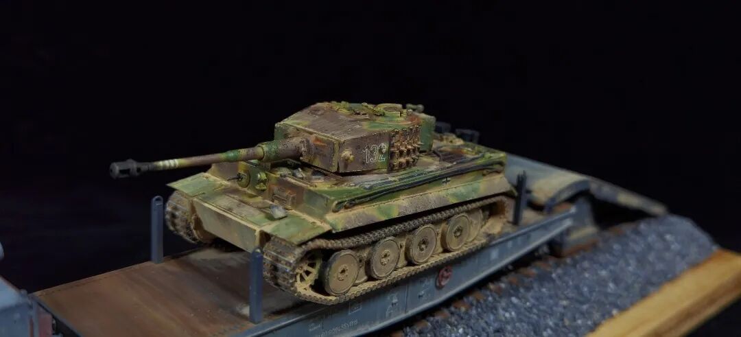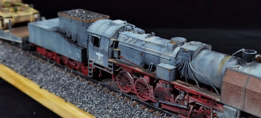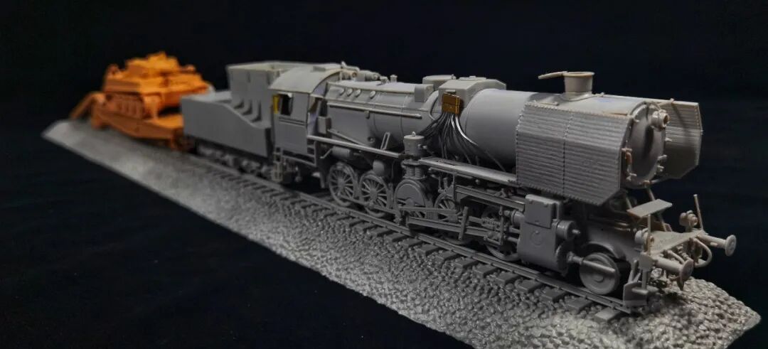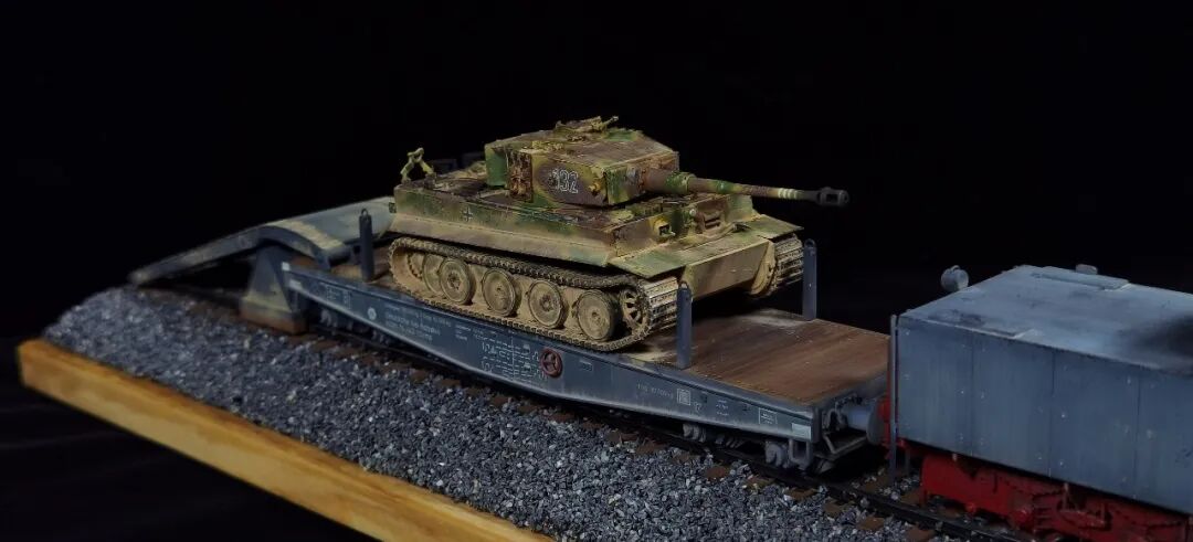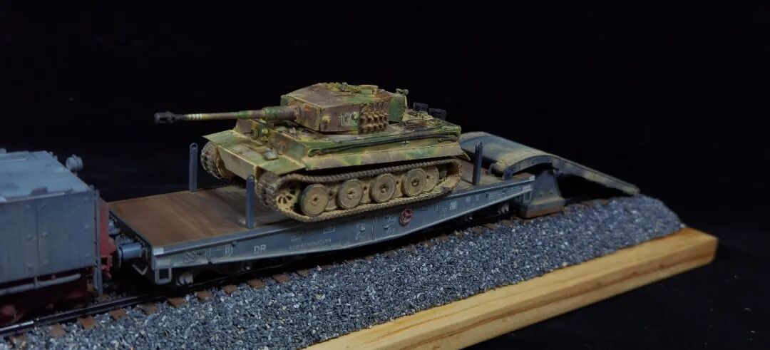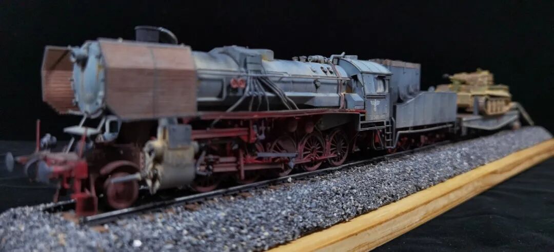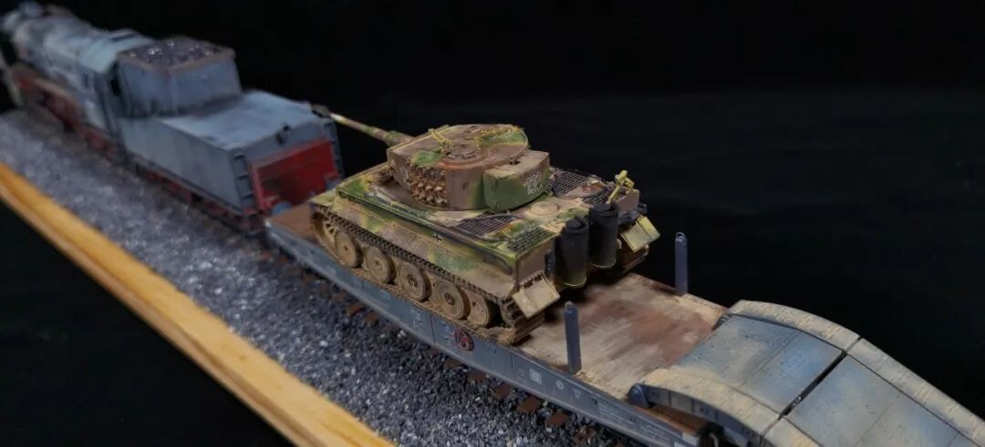 这一次做的是小号手72比例的二战德国“战争机车”BR52蒸汽火车+80吨拖车配虎式。BR52型蒸汽机车是德意志帝国铁路(DRG)在二战期间大量制造的一种轴式为2-10-0的蒸汽机车,是一种“战争机车”,两盒板件呢其实是毫无关联的,最后被我强行接在一起,脑补背景为:二战末期,德国把重型装备回送至柏林做最后的抵抗。路基的石子是刷的乳胶然后撒一层1mm左右的石子,质感意外的不错而且乳胶干了之后路基完全硬化也方便运输。