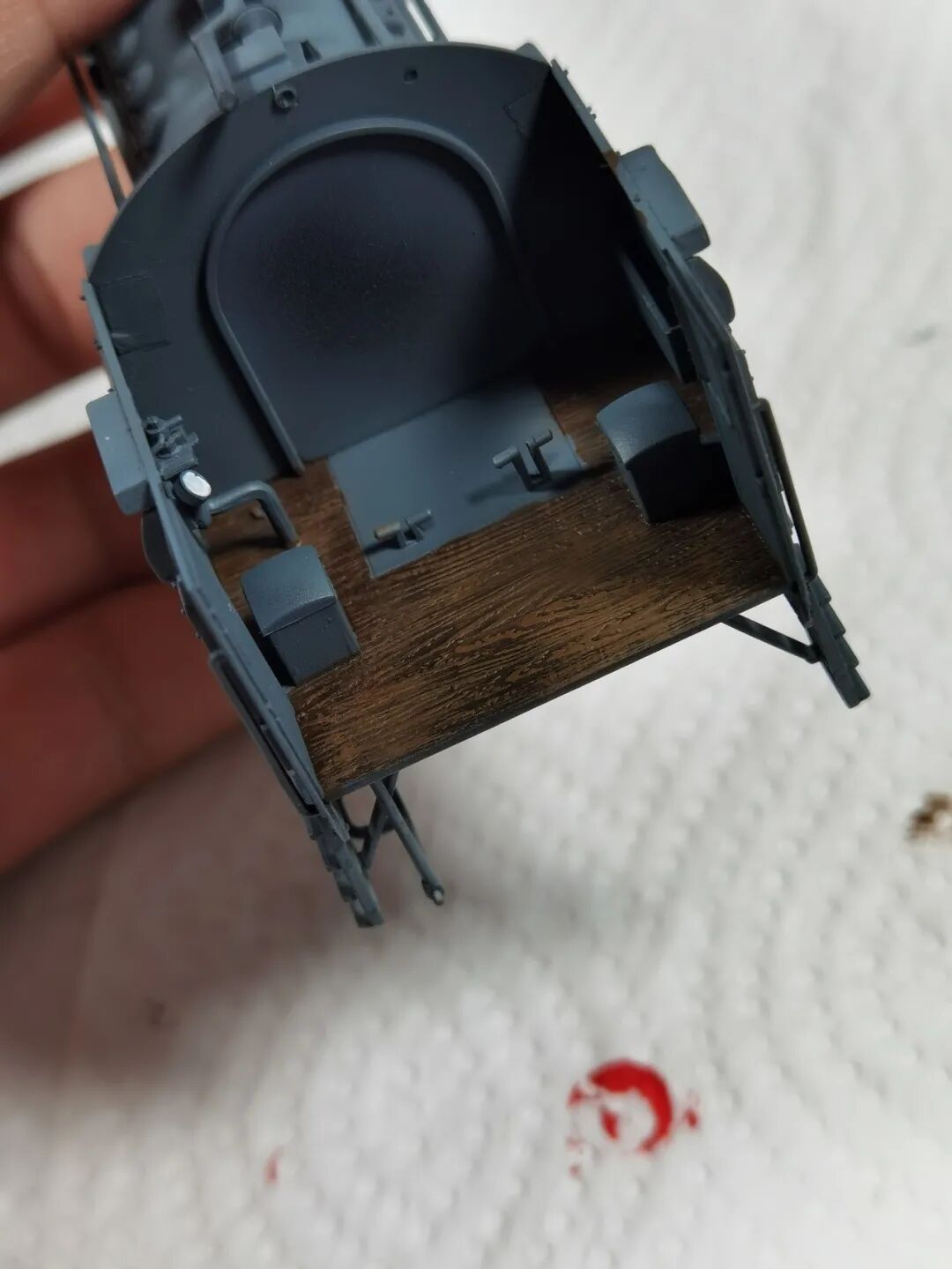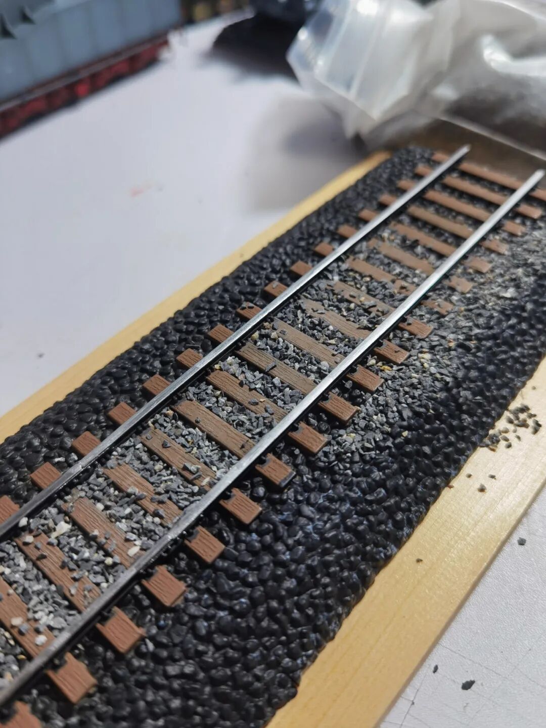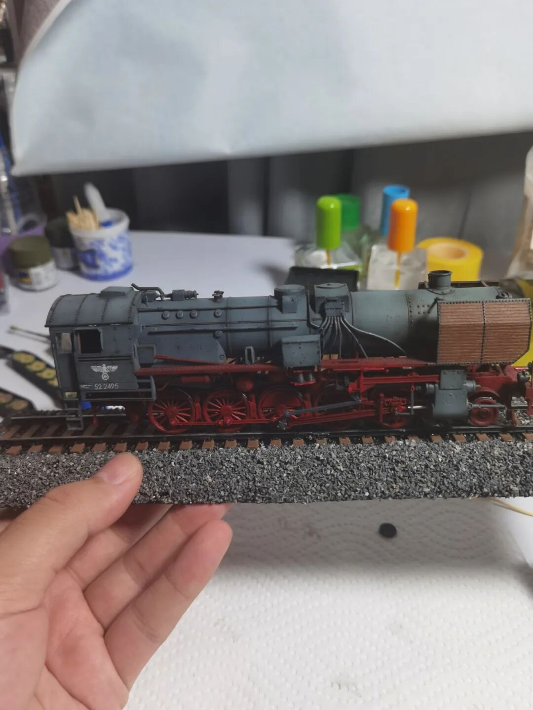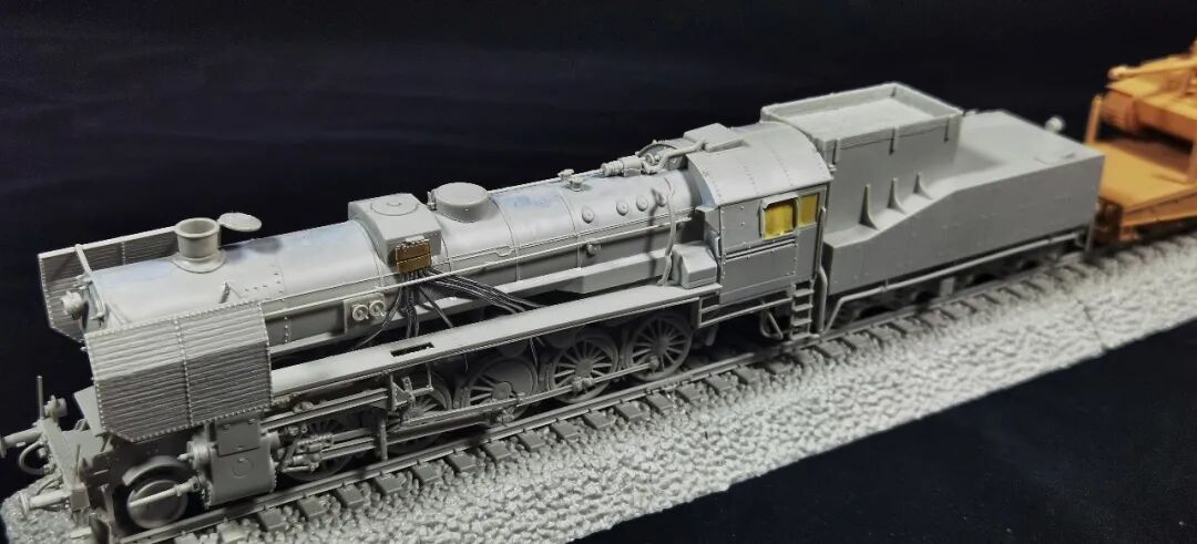这一次做的是小号手72比例的二战德国“战争机车”BR52蒸汽火车+80吨拖车配虎式。BR52型蒸汽机车是德意志帝国铁路(DRG)在二战期间大量制造的一种轴式为2-10-0的蒸汽机车,是一种“战争机车”,两盒板件呢其实是毫无关联的,最后被我强行接在一起,脑补背景为:二战末期,德国把重型装备回送至柏林做最后的抵抗。路基的石子是刷的乳胶然后撒一层1mm左右的石子,质感意外的不错而且乳胶干了之后路基完全硬化也方便运输。