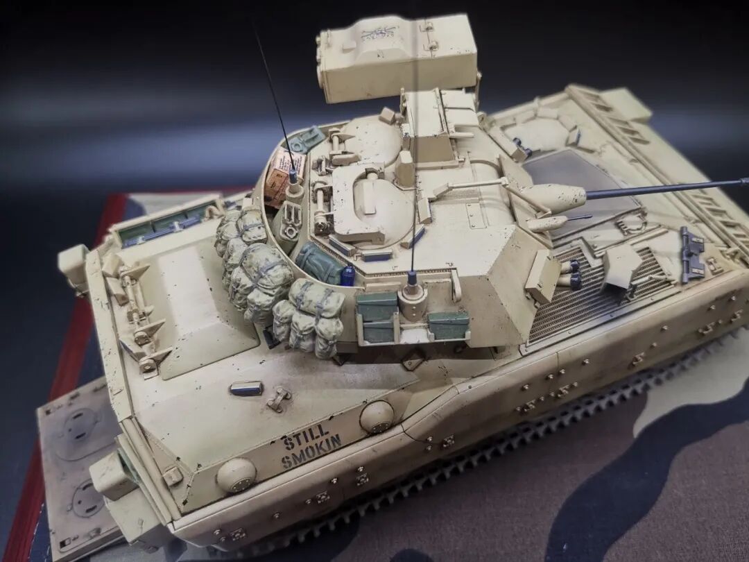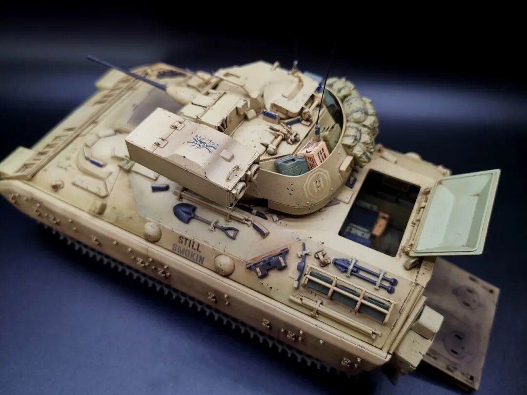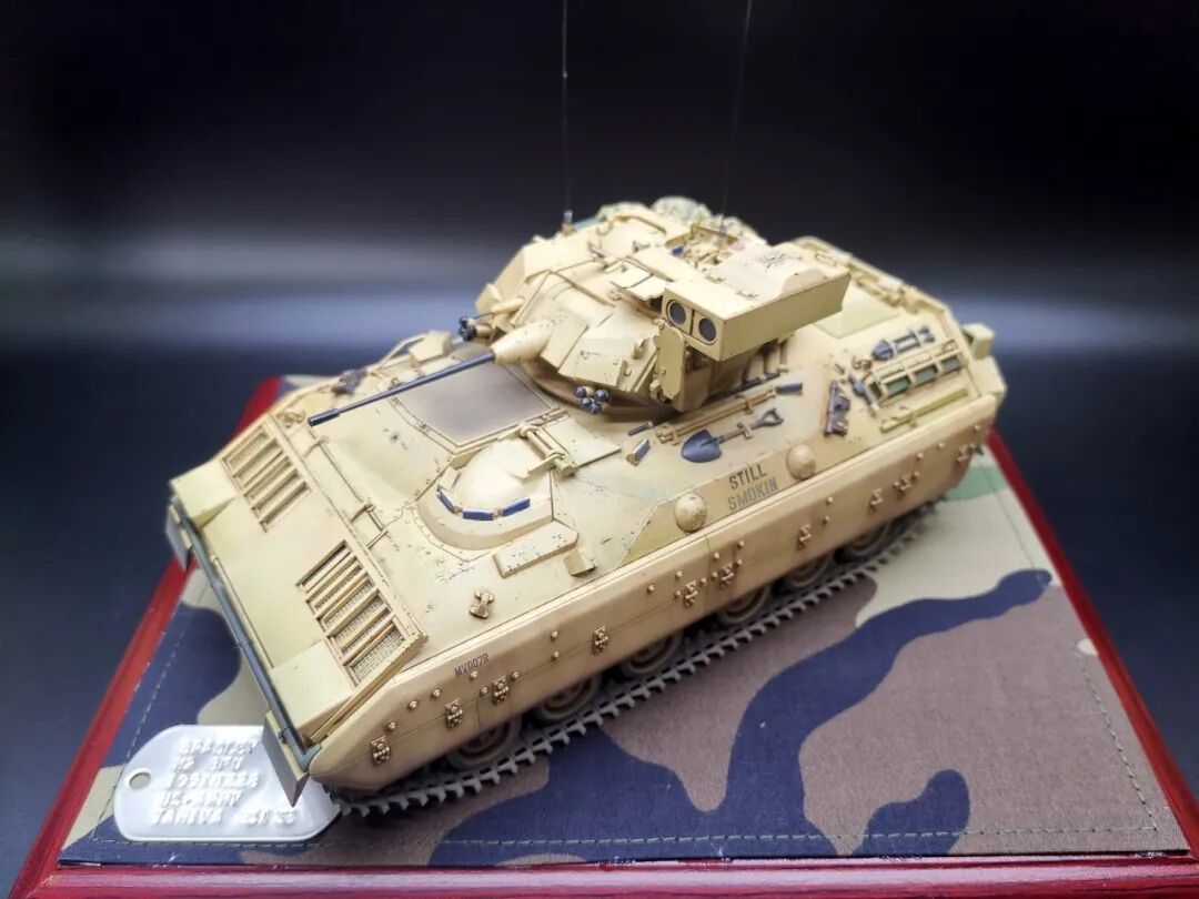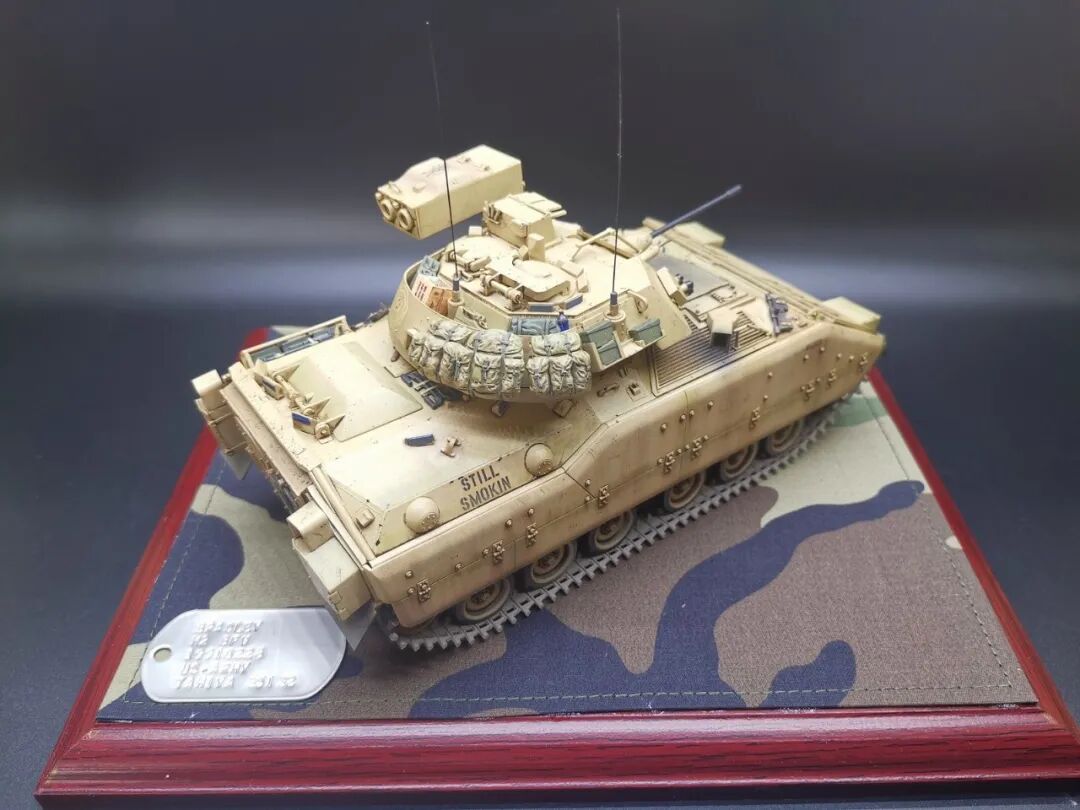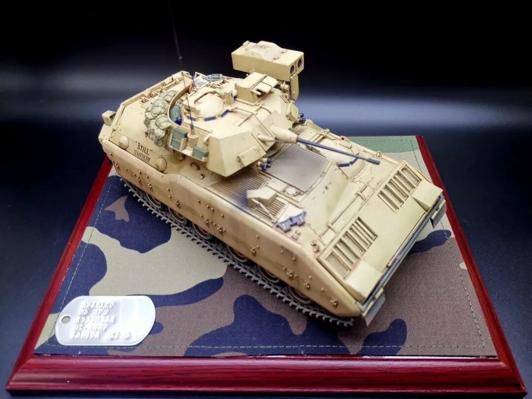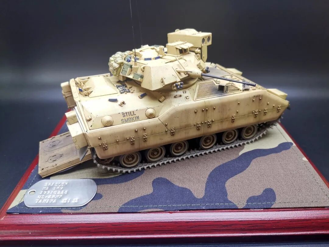 模型介绍:这个作品M2布莱德利是田宫1/35比例板件直做,就添加了几个树脂包裹和纸质补给箱,流道拉丝天线和小水瓶。车身颜色自调美军沙漠色涂装喷涂,车内部颜色也参考实车图自调色而成喷涂轻度旧化,在易掉漆和踩踏部分做稍重旧化。买的现成木地台添加美军原品BDU迷彩布料作为地台布,用上世纪90年代美军身份牌凹刻车辆信息作为铭牌(用美军身份牌作为车辆信息铭牌是我个人的创意)。