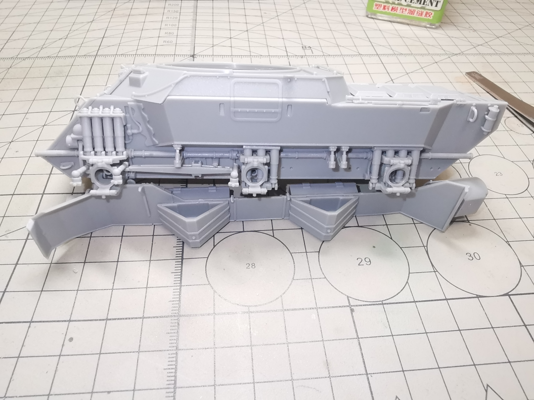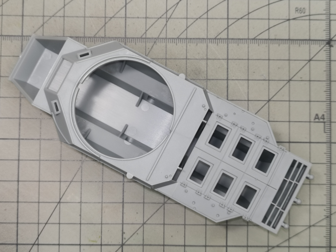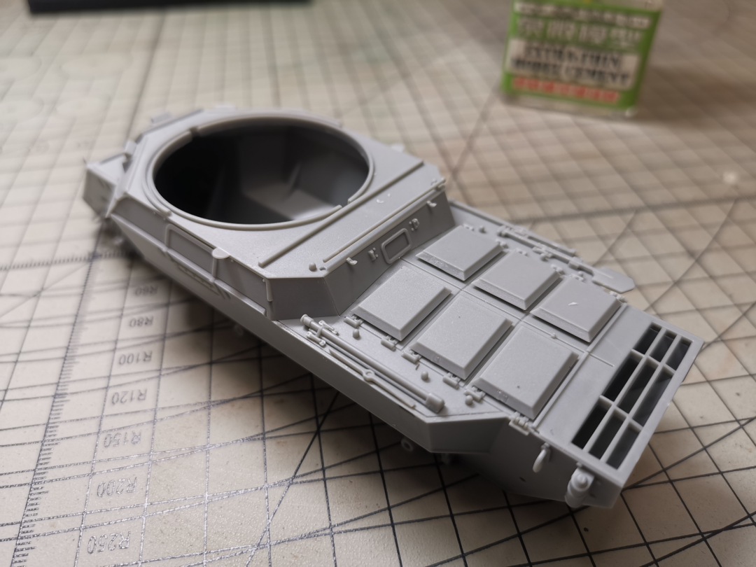 车体,上下车体虽然存在组合缝隙,但都集中在不明显的部位,可以通过胶水溶胶解决这个问题。大量使用了滑块开模,并且合模线控制的非常好。蚀刻片数量少,仅只给出了一小块没有什么细节的防爆网,制作起来比较好处理。