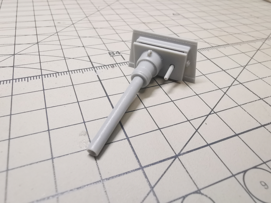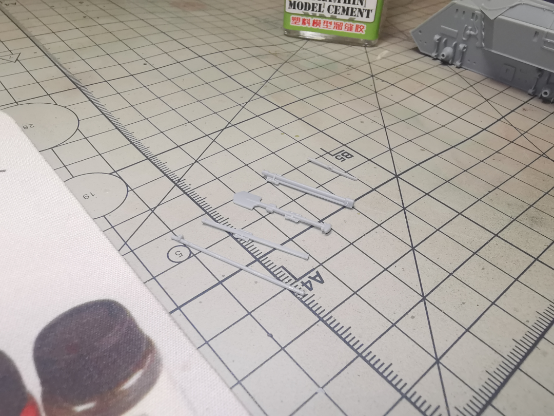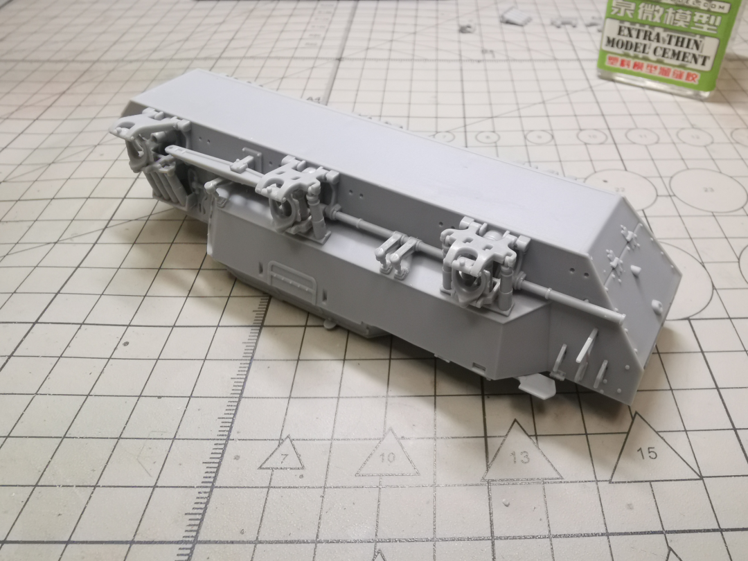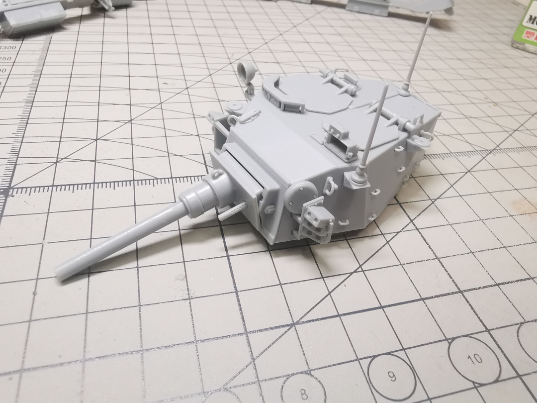 炮管部分是滑块一体开出,合模线也是用笔刀就可以轻松刮去,但是没有线膛炮的膛线。同轴机枪也是滑块开模开出了枪口,直接推入炮盾的机枪口就可。然而由于我在内侧耳轴粘接过于谨慎,造成了炮管的‘不举’。