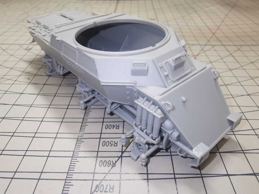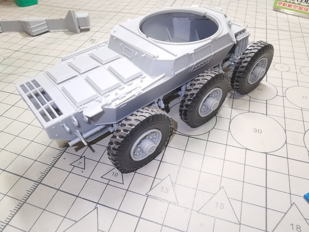 外包装盒上有注明,此车是活动悬挂,制作的时候不需要点胶,卡扣式的组合方式,制作并无难度。唯一要说的就是全车最突出的合模线都集中在了这里,上下摇臂的两侧都有明显的合模线,还是用笔刀刮一刮就可以处理,并且考虑到后期上土之后就被遮盖了,就没有着力去修。