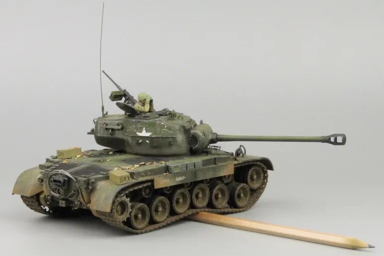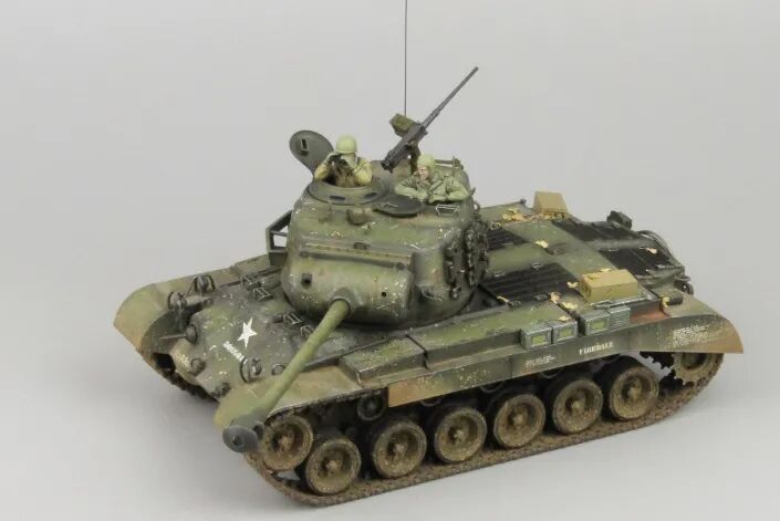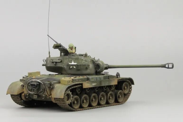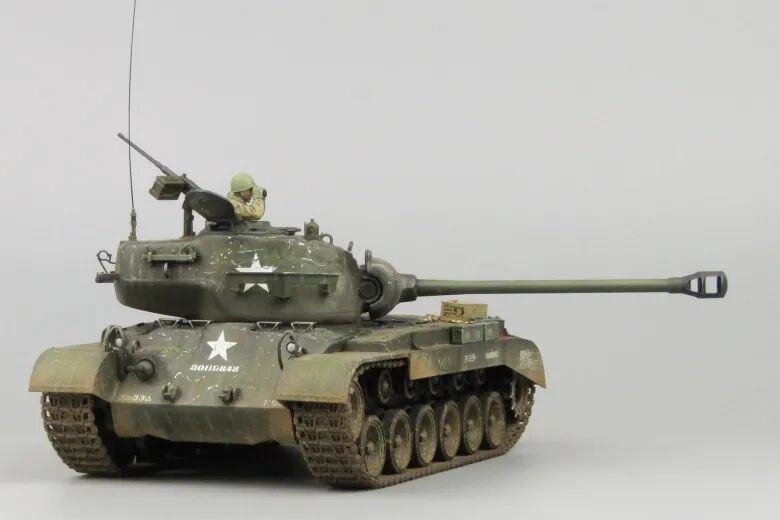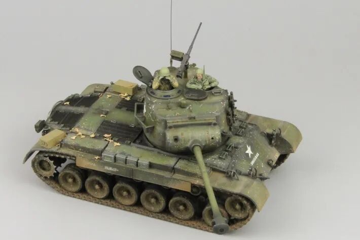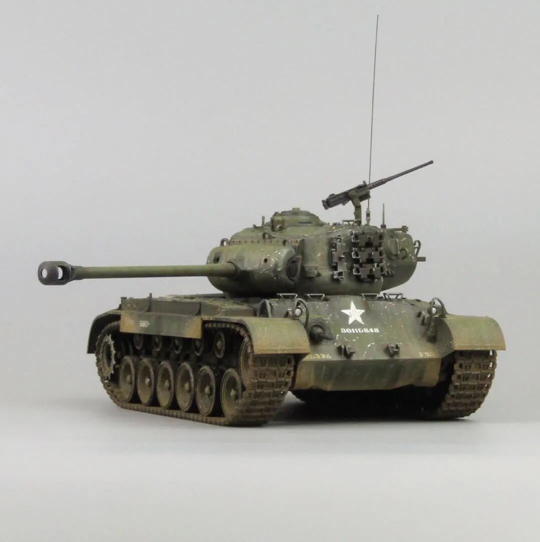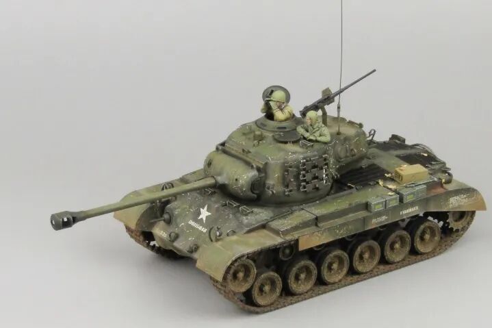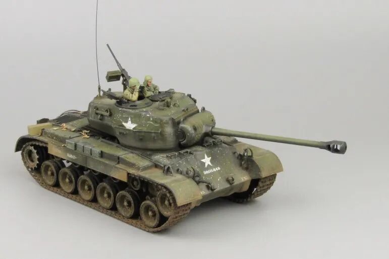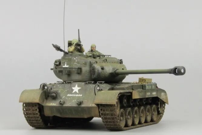 M26“潘兴”坦克于第二次世界大战末期装备美国陆军的重型坦克,专为对付德国的虎式坦克而设计,美国人于1943年4月开始改造搭载90毫米炮的T26新型重型坦克。今天的主角M26就是T26的改良型T26E3,这种车型勉强在二战结束前服役,1945年1月投入实战20辆。比起高大的M4“谢尔曼”系列坦克,M26低平而良好的防弹车形更具现代色彩,它的主炮威力和装甲厚度比起以往所有的美国坦克,都有飞跃性提高。但由于由于服役晚,“潘兴”在二战中并未发挥出太大作用。