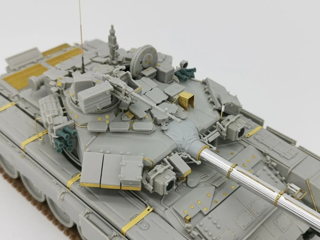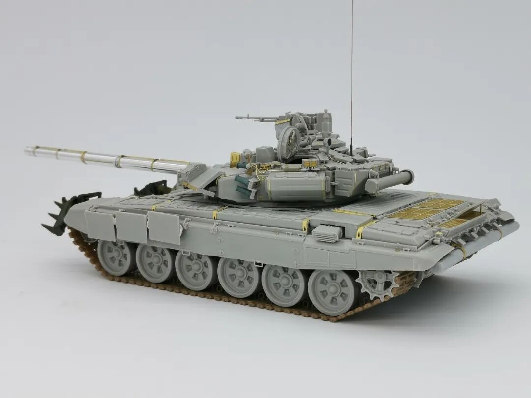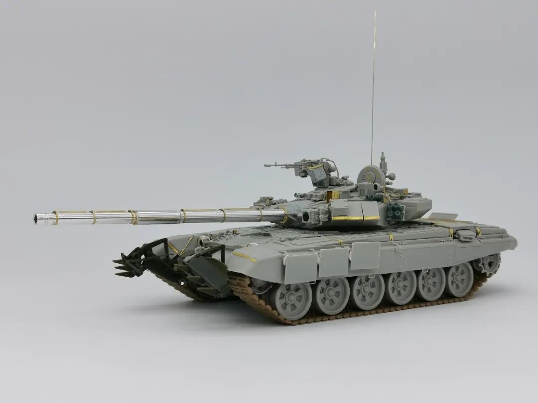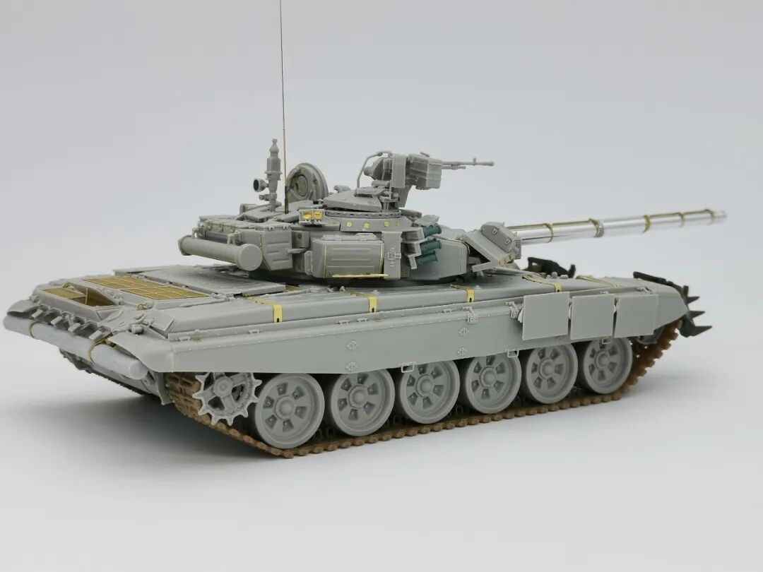 今天的主角T-90A坦克(1999年),为T-90坦克的继续发展,也是T-90A坦克的原型样车,主要改进是采用新型履带、焊接炮塔、V-9252发动机、热像仪、深水涉渡设备等。当然啦,也是小编最爱的一型T-90。
