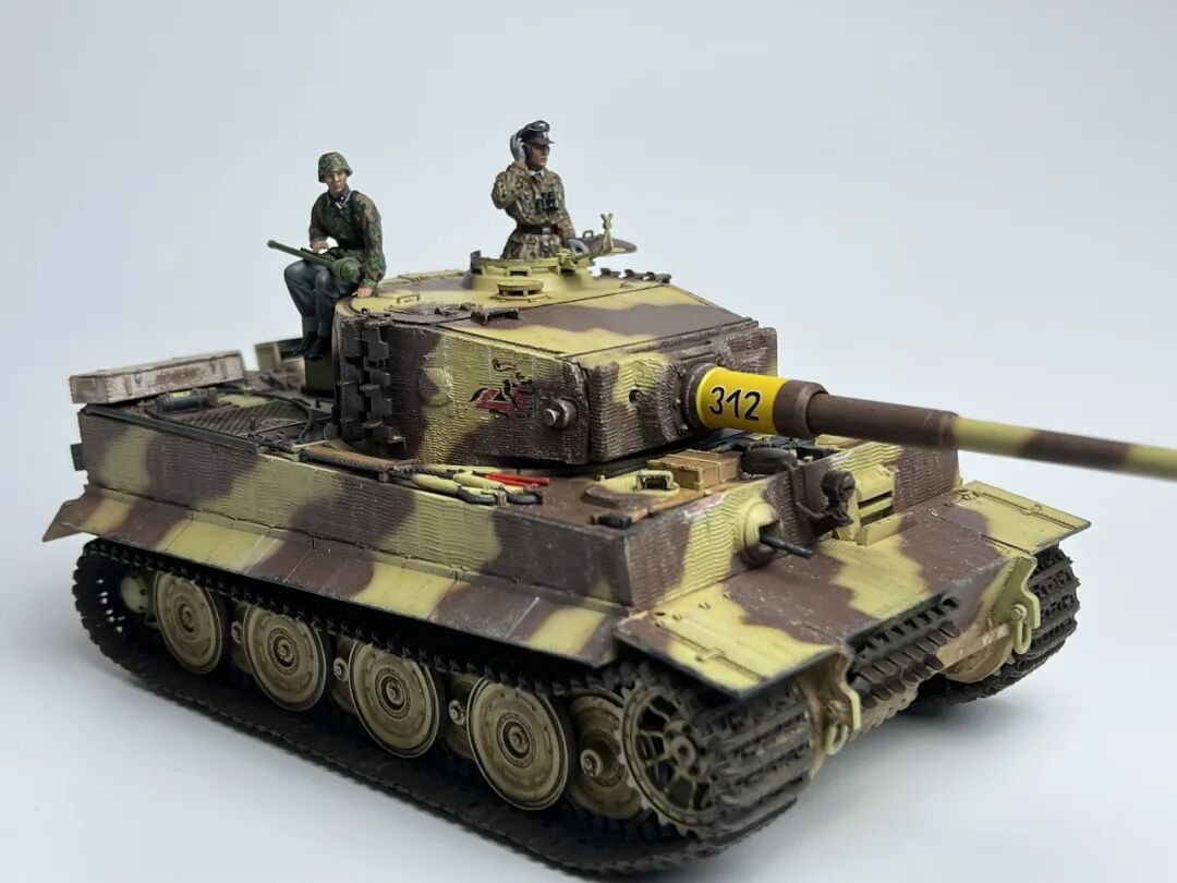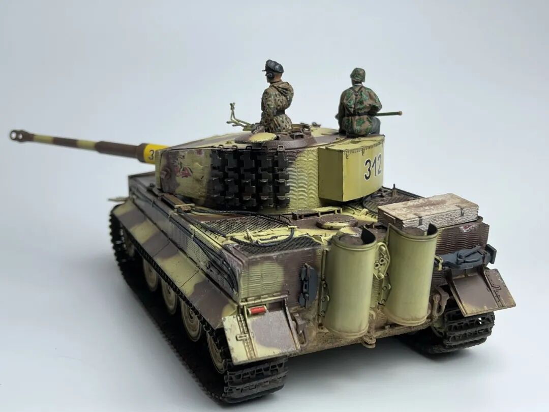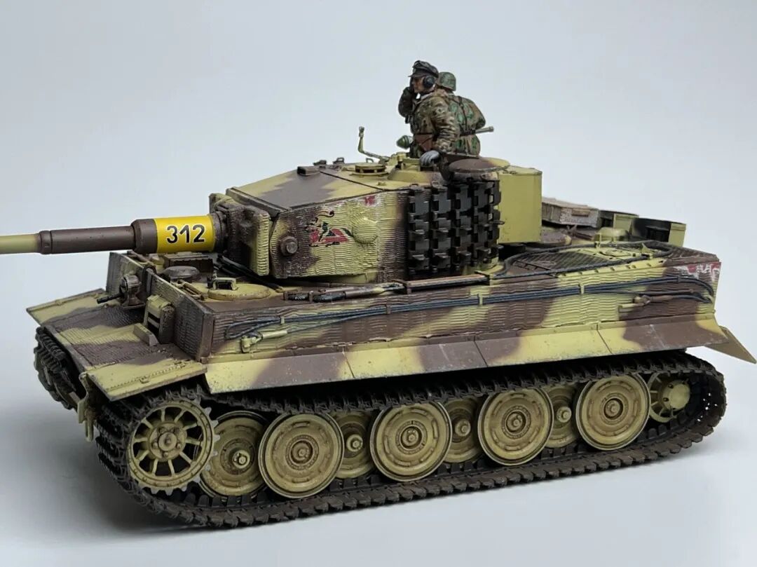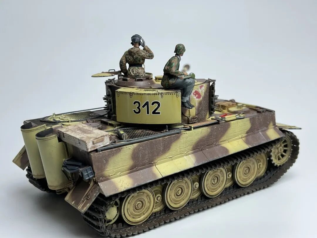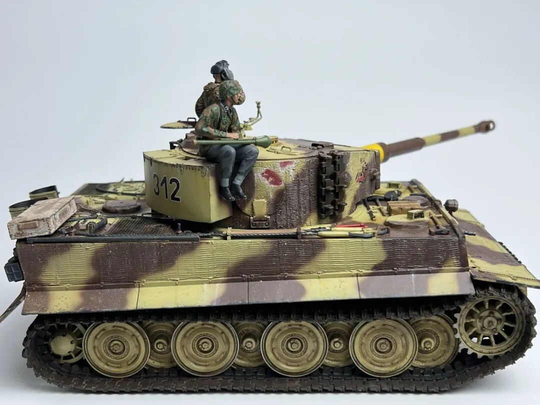 作为回坑的第一个坦克作品当然要选择大名鼎鼎的虎式坦克啦!套件选择了小号手的后期型虎式,不得不说小号手的虎式以及虎王都是便宜大碗,非常适合练习技术(做坏了不心疼)。由于号手给出的防磁贴过于规整,我选择了使用水性防磁膏配合麦田虎贡献的刮片自制了防磁装甲(第一次刮防磁请多多包涵哈),涂装选择了极具特色的505营312号车,做了些轻度旧化(太久没做坦克了已经不会旧化了)然后配上祖国牌树脂兵人以及边境四号H中给出的塑料兵人,完全无考证属于是快乐随心模型。