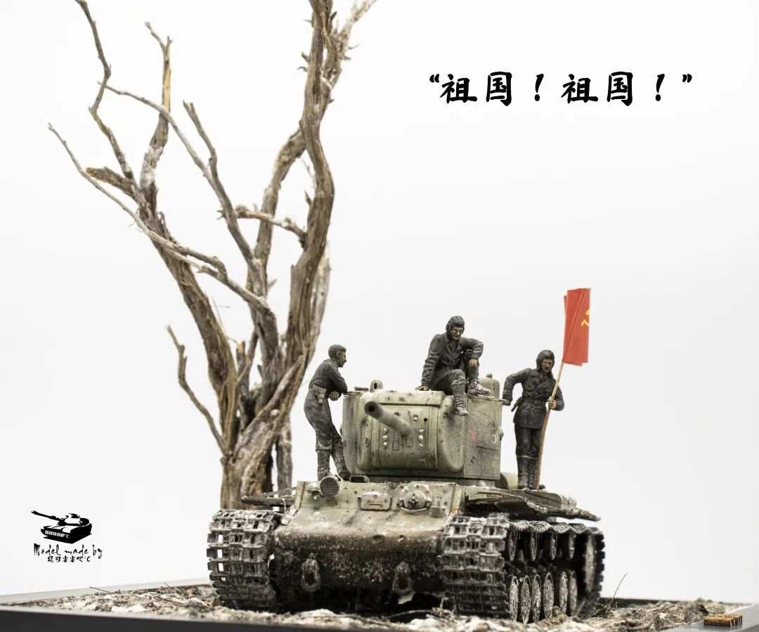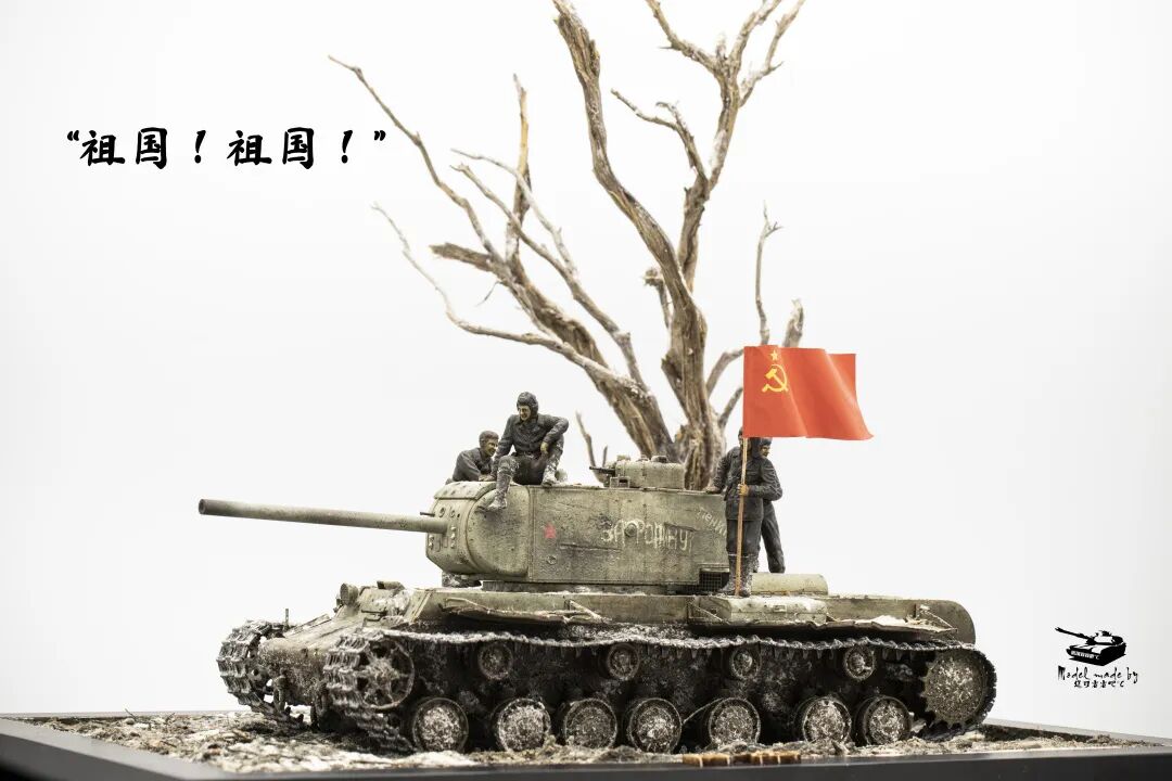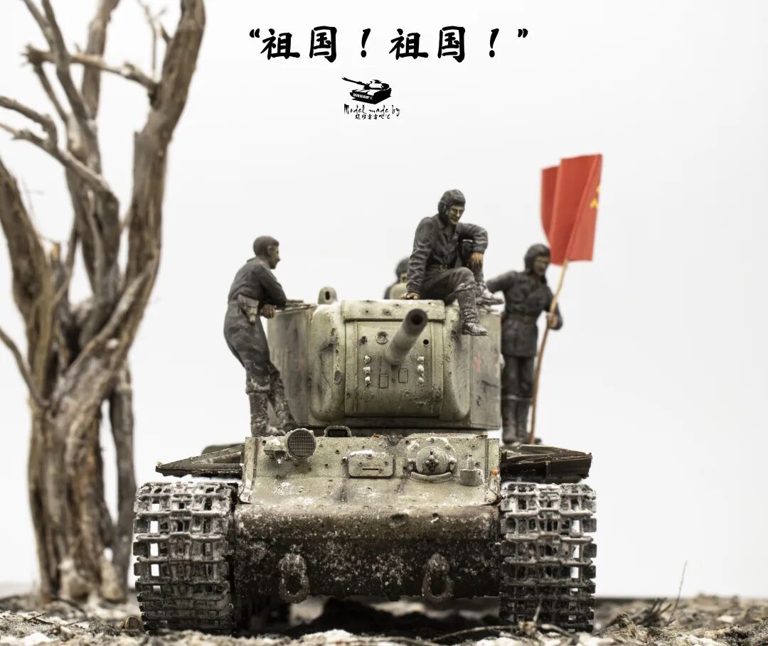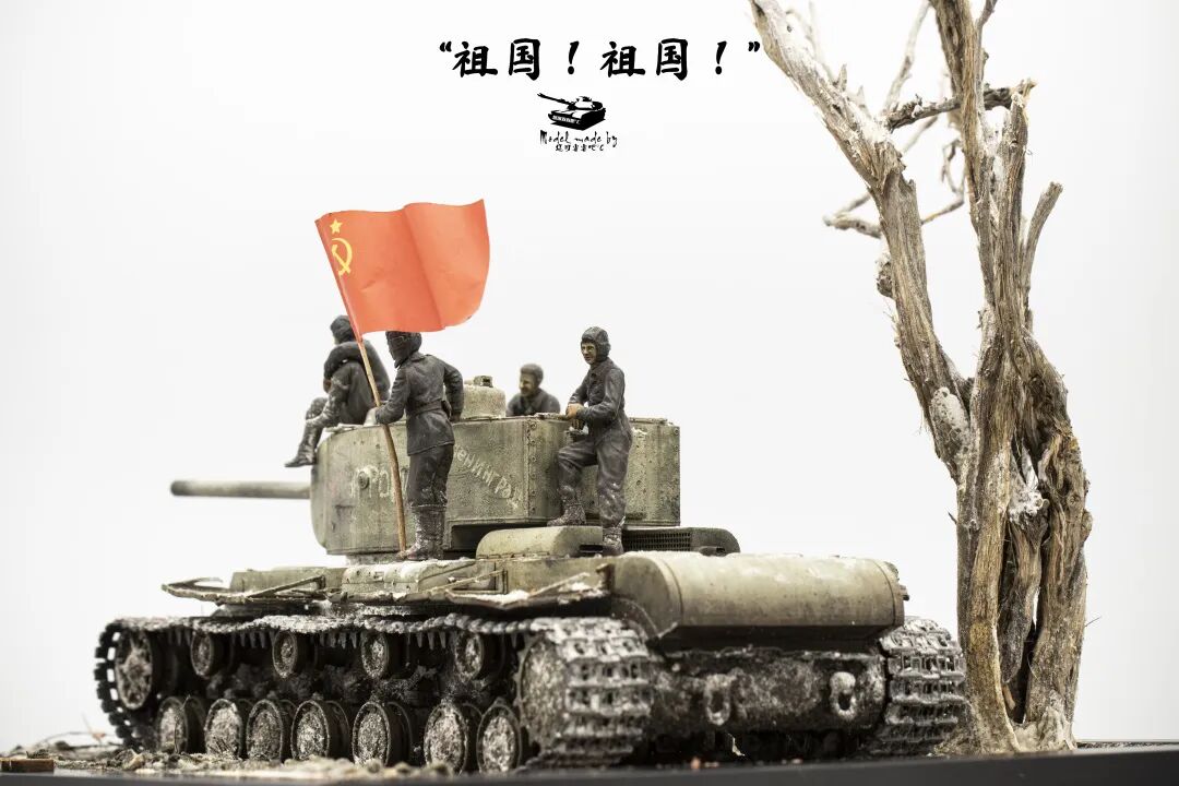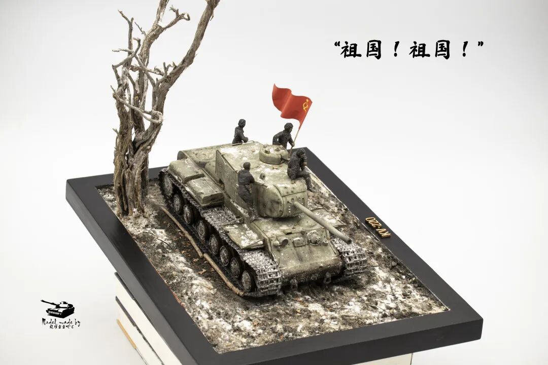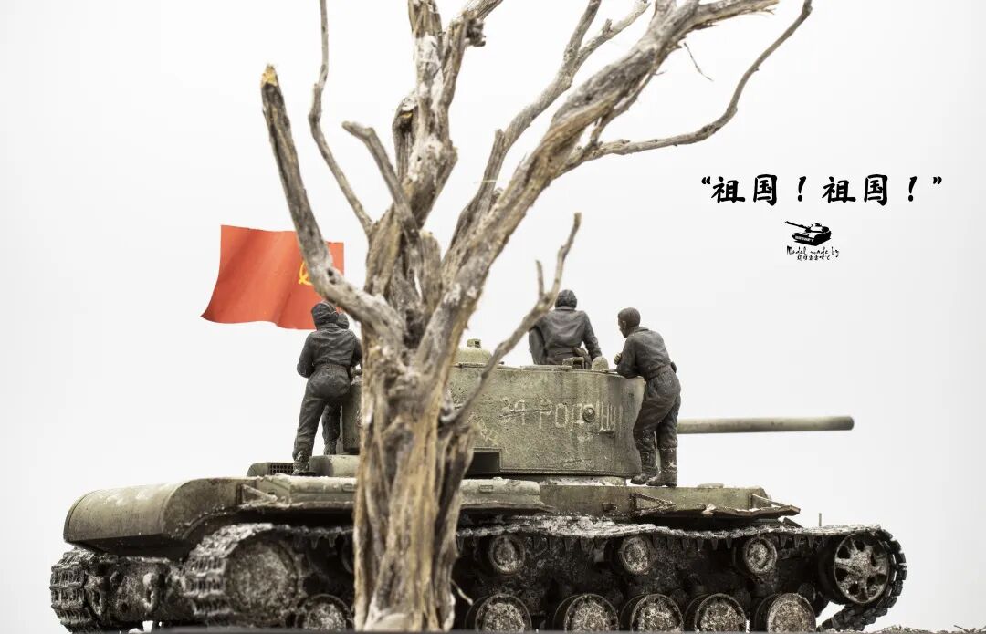 1941年9月8日,列宁格勒通往外界的通道被德军全部切断,长达900天的围城战正式打响。匮乏的物资和吃紧的战况对基洛夫厂的生产工作产生了巨大影响。不管量产车还是原型车,能打德军的都是好坦克。这两辆炮塔上刷着“为了祖国”的KV220试验车被编入守城部队的第124坦克旅,二号车于1941年11月15日支援步兵的战斗中被完全击毁,一号车则跟随部队战斗到了1942年2月。坦克板件选自号手05553,兵人板件选自田宫35214,无套改直做。