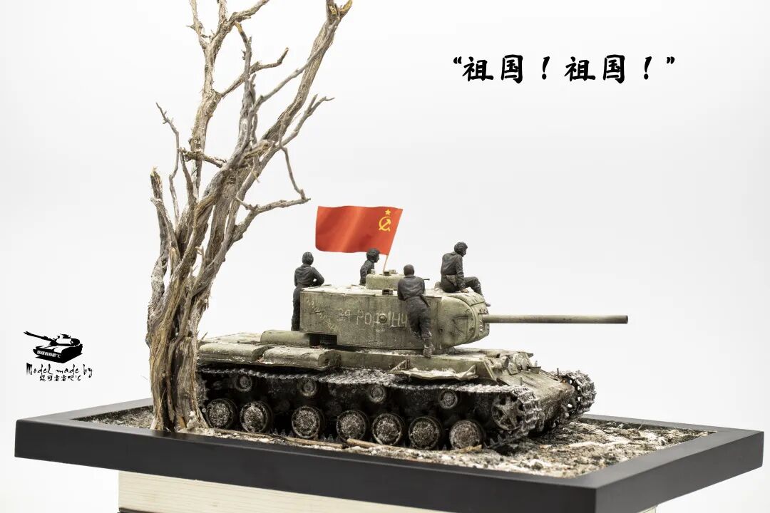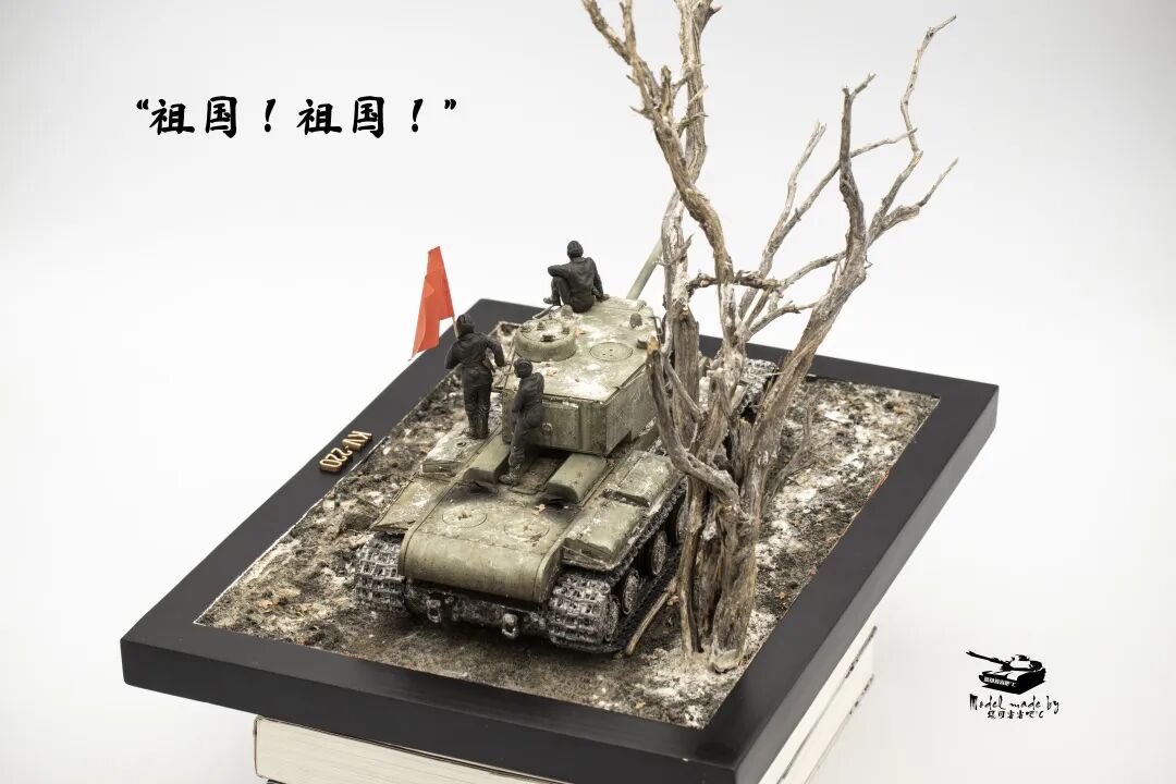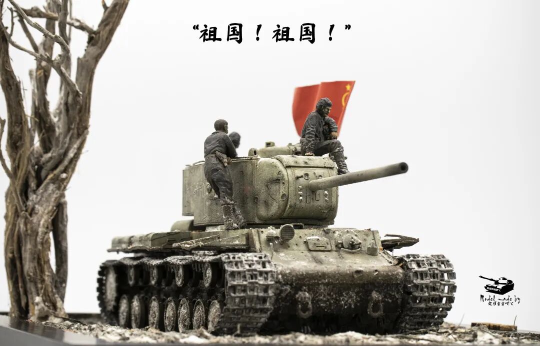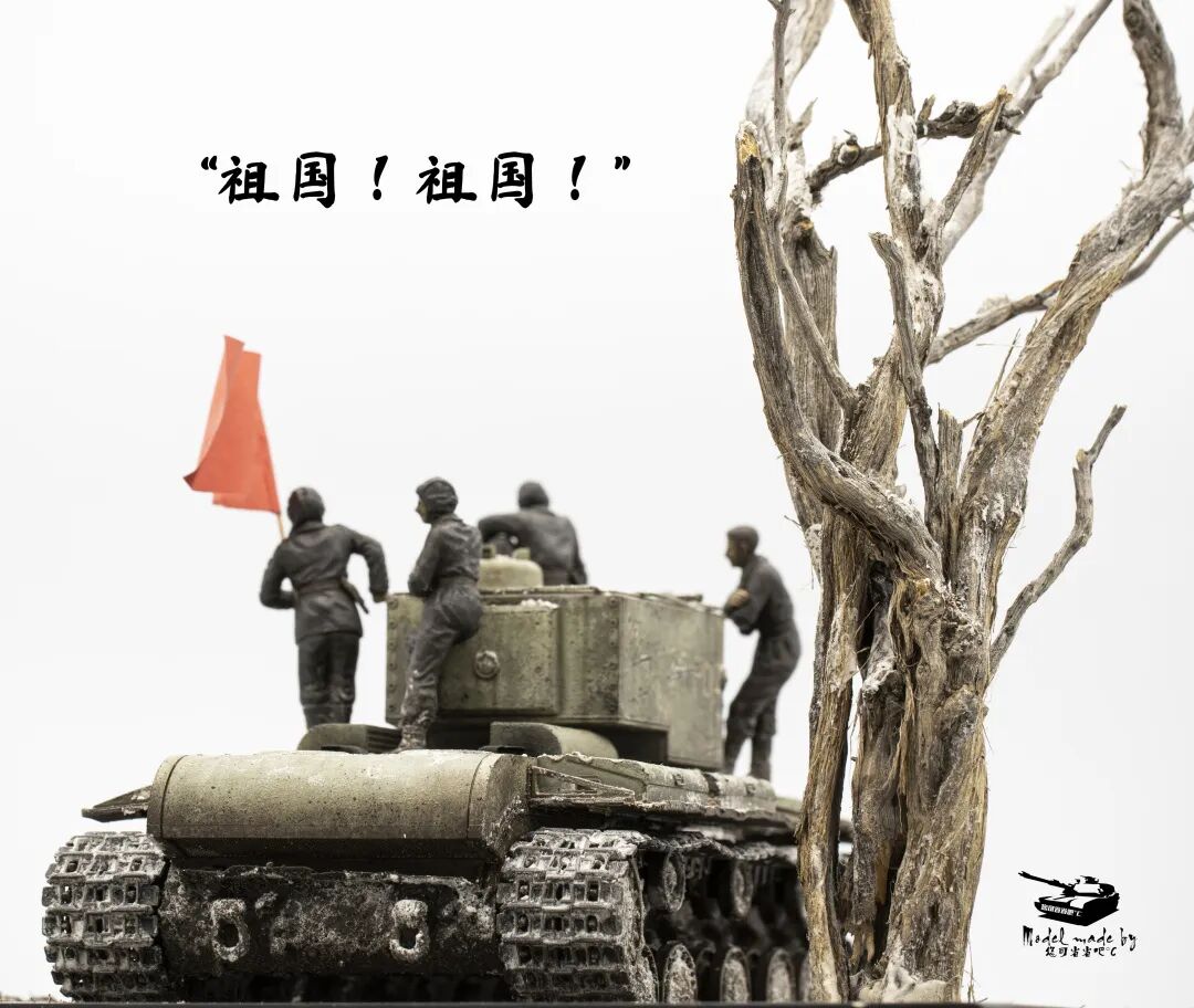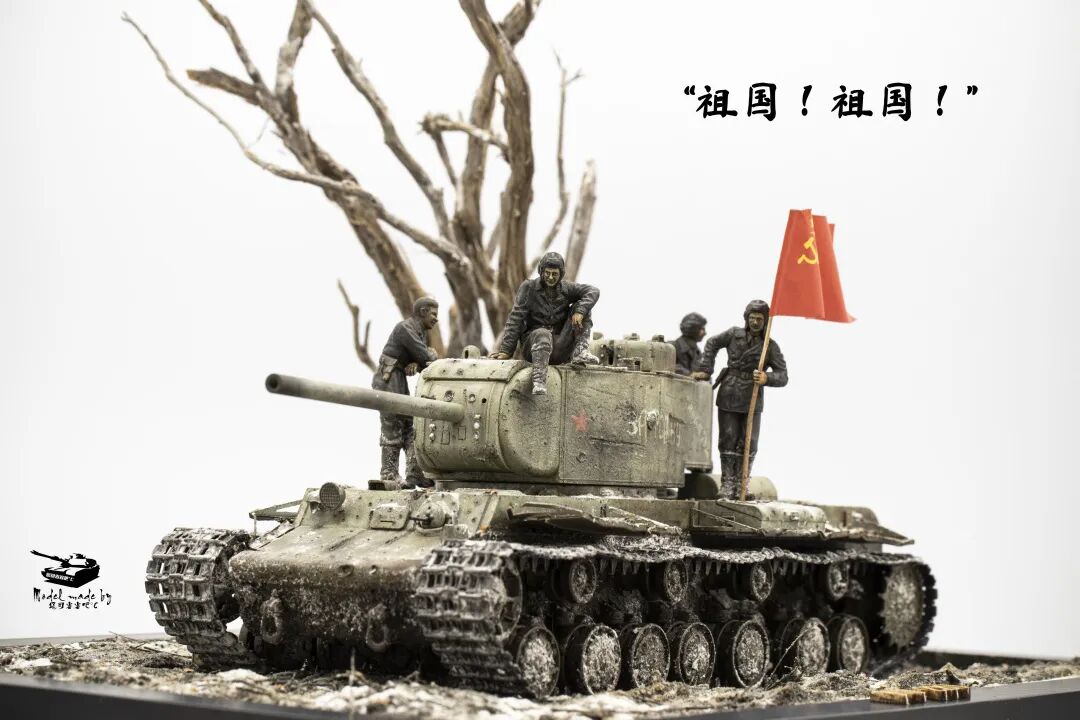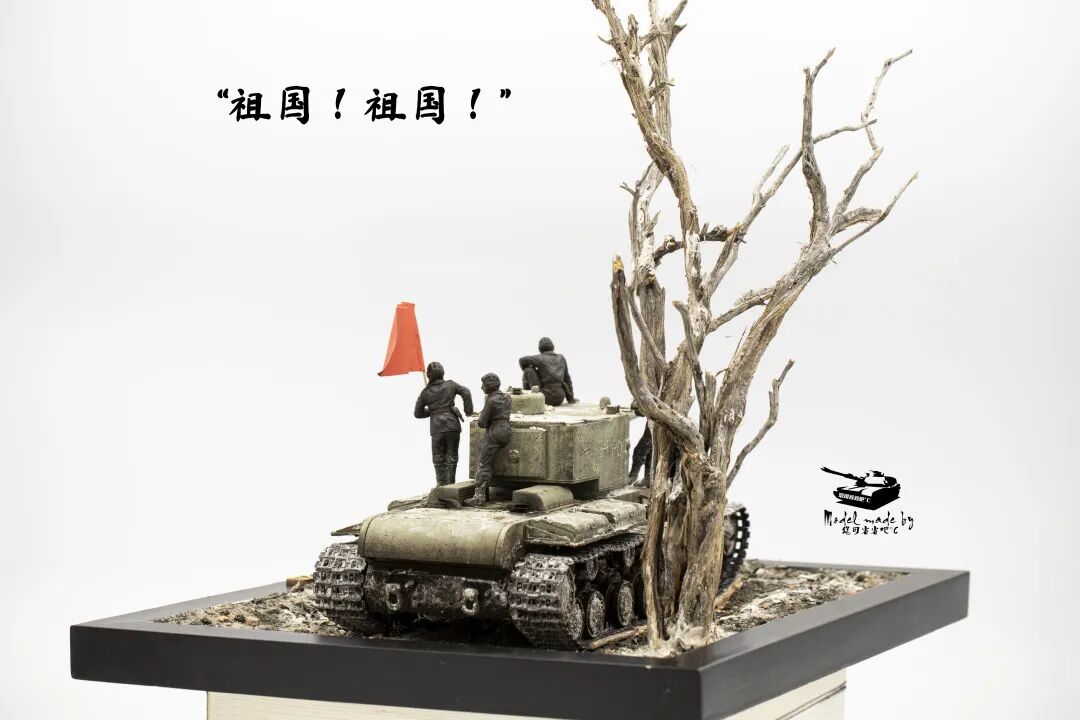 1941年9月8日,列宁格勒通往外界的通道被德军全部切断,长达900天的围城战正式打响。匮乏的物资和吃紧的战况对基洛夫厂的生产工作产生了巨大影响。不管量产车还是原型车,能打德军的都是好坦克。这两辆炮塔上刷着“为了祖国”的KV220试验车被编入守城部队的第124坦克旅,二号车于1941年11月15日支援步兵的战斗中被完全击毁,一号车则跟随部队战斗到了1942年2月。坦克板件选自号手05553,兵人板件选自田宫35214,无套改直做。
