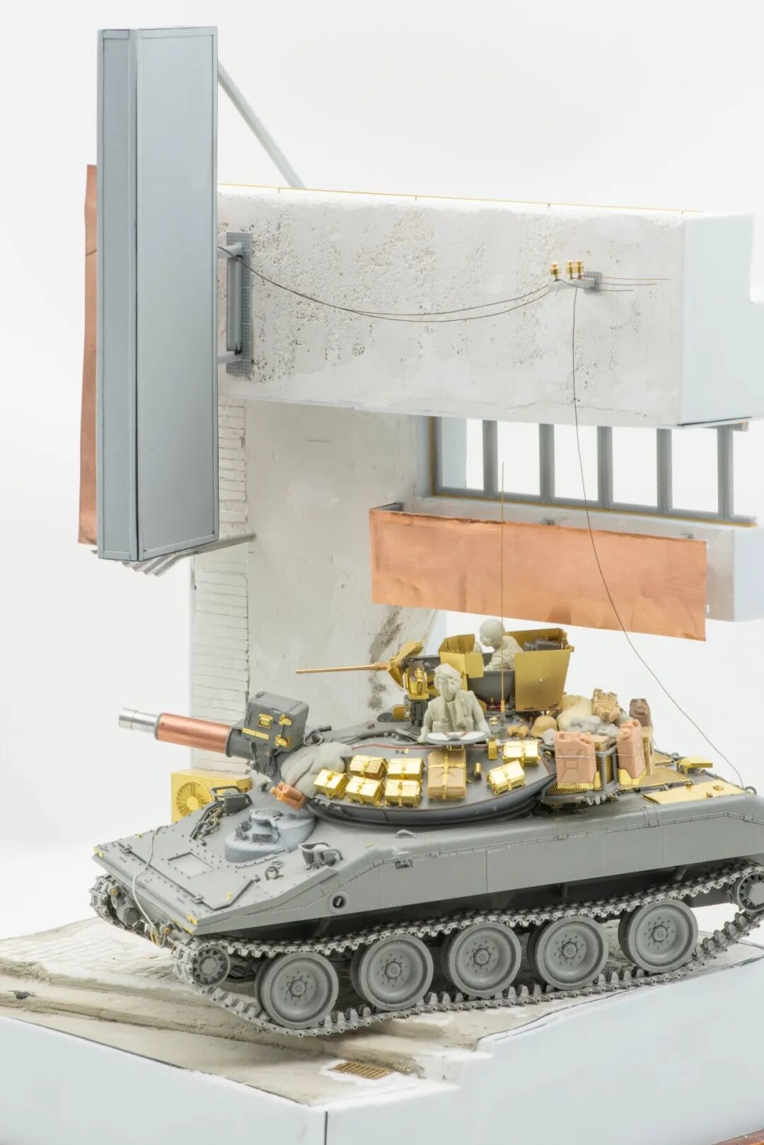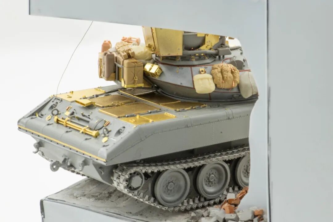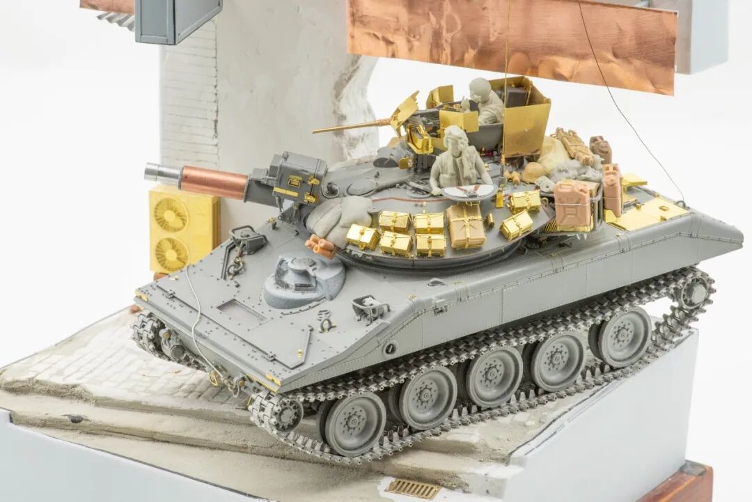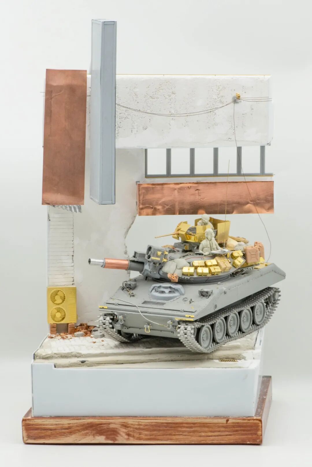 设定背景是1989年美军入侵巴拿马时的M551,像是前期和后期的混合形态,车体配件上既能看到前期型号的东西,也能发现后期91年海湾战争时期的设备。利用了一点田宫的美军包裹,尾栏载物用AB补土捏制。