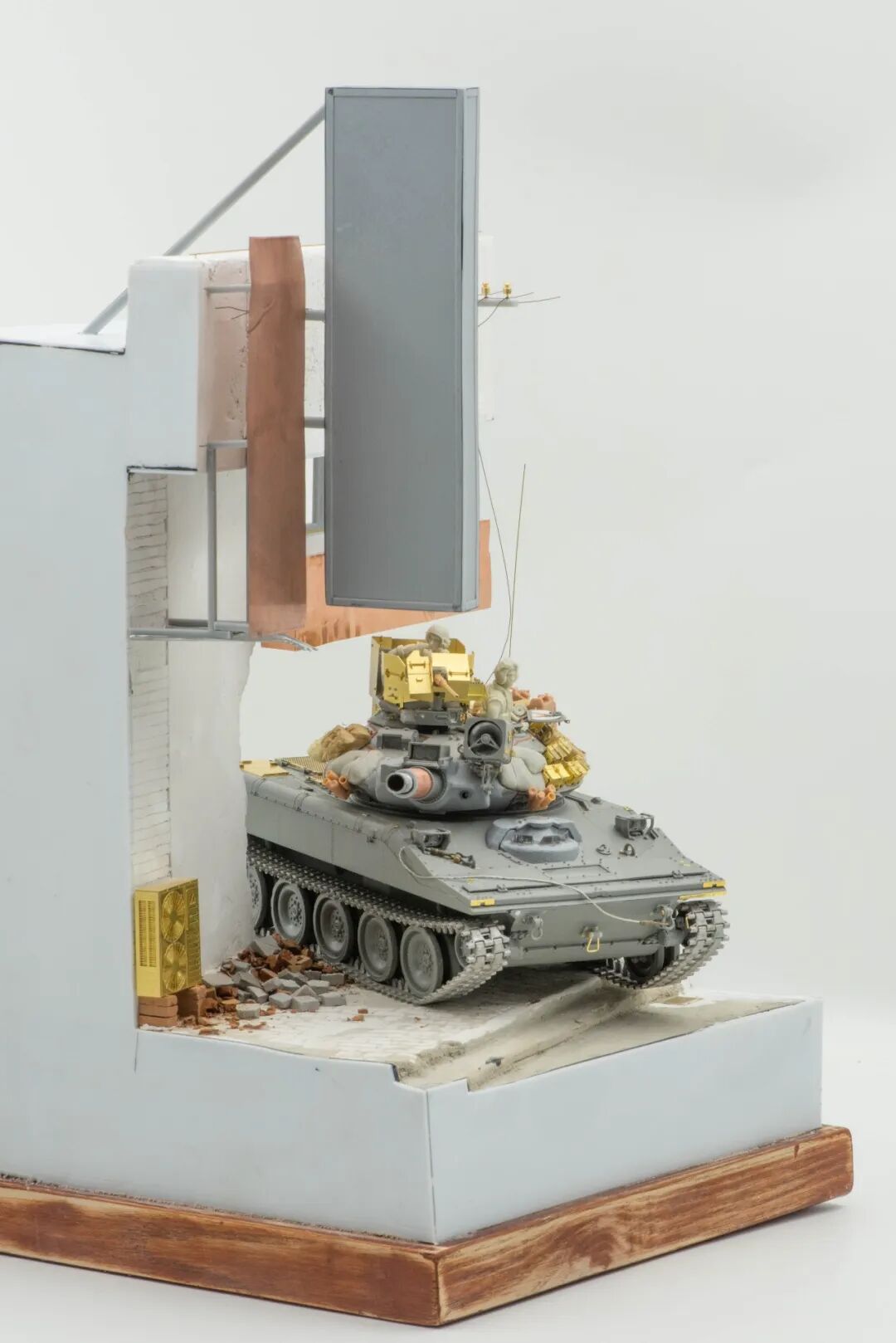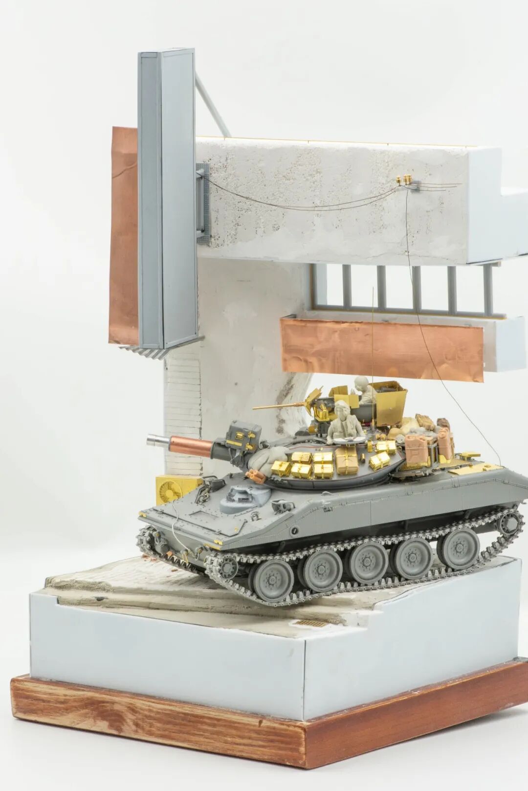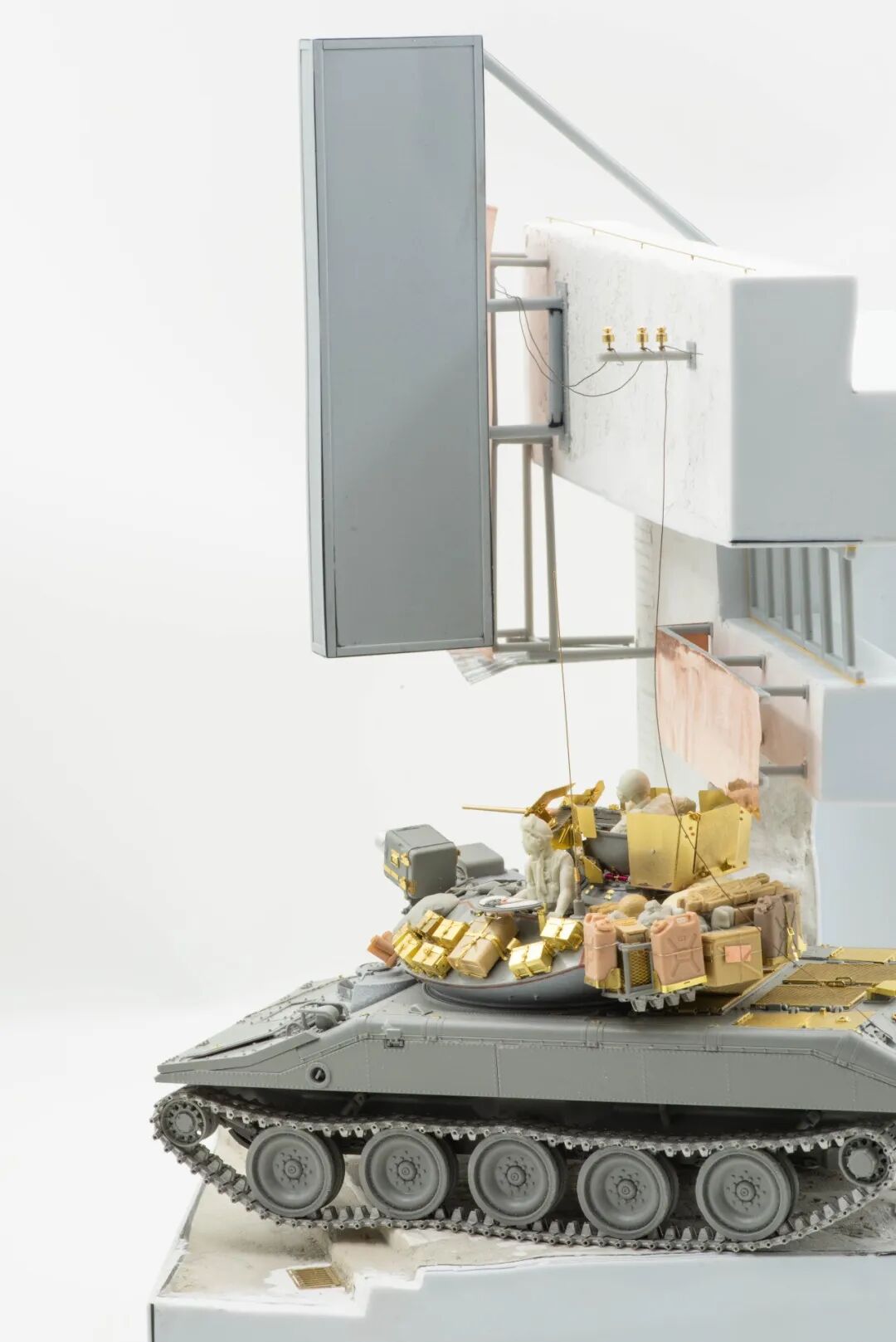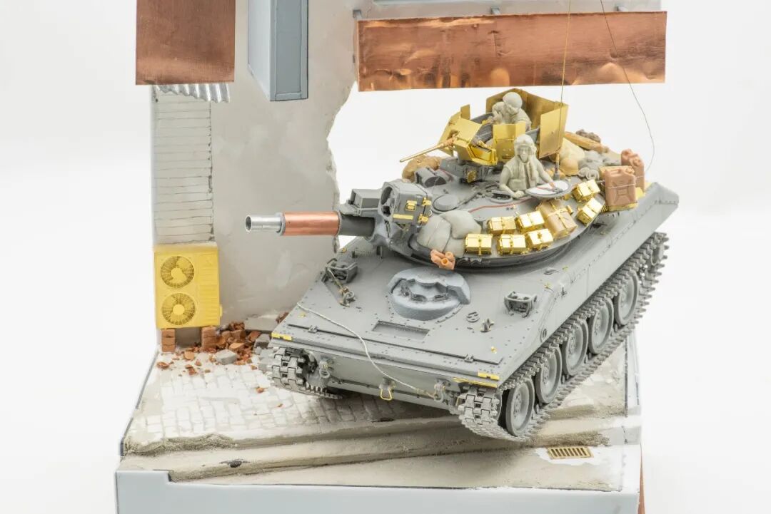 设定背景是1989年美军入侵巴拿马时的M551,像是前期和后期的混合形态,车体配件上既能看到前期型号的东西,也能发现后期91年海湾战争时期的设备。利用了一点田宫的美军包裹,尾栏载物用AB补土捏制。