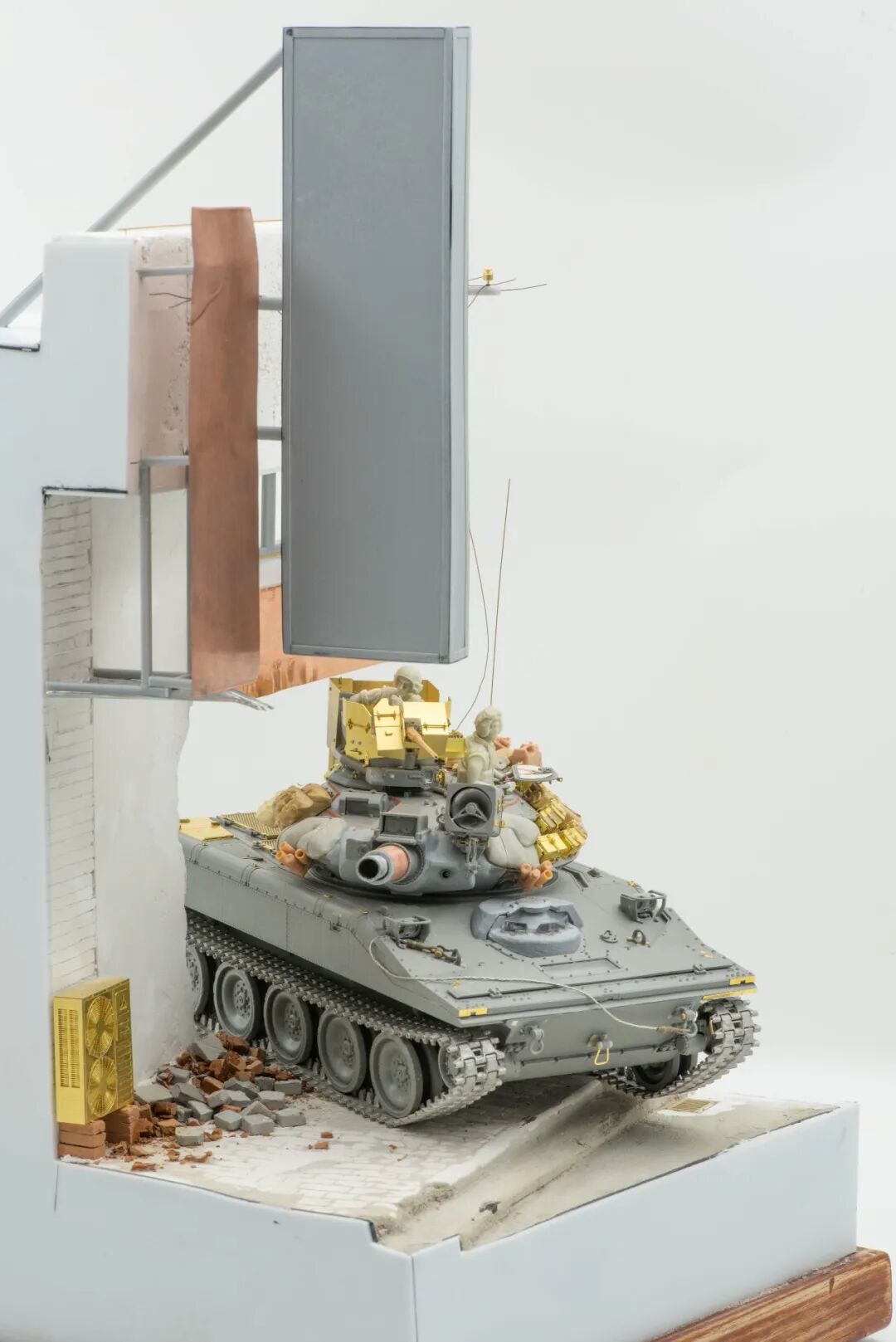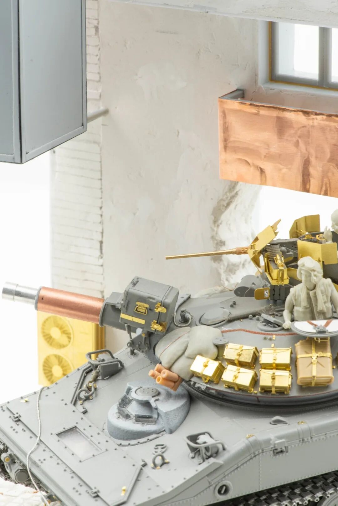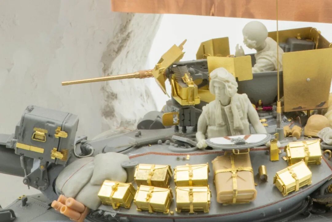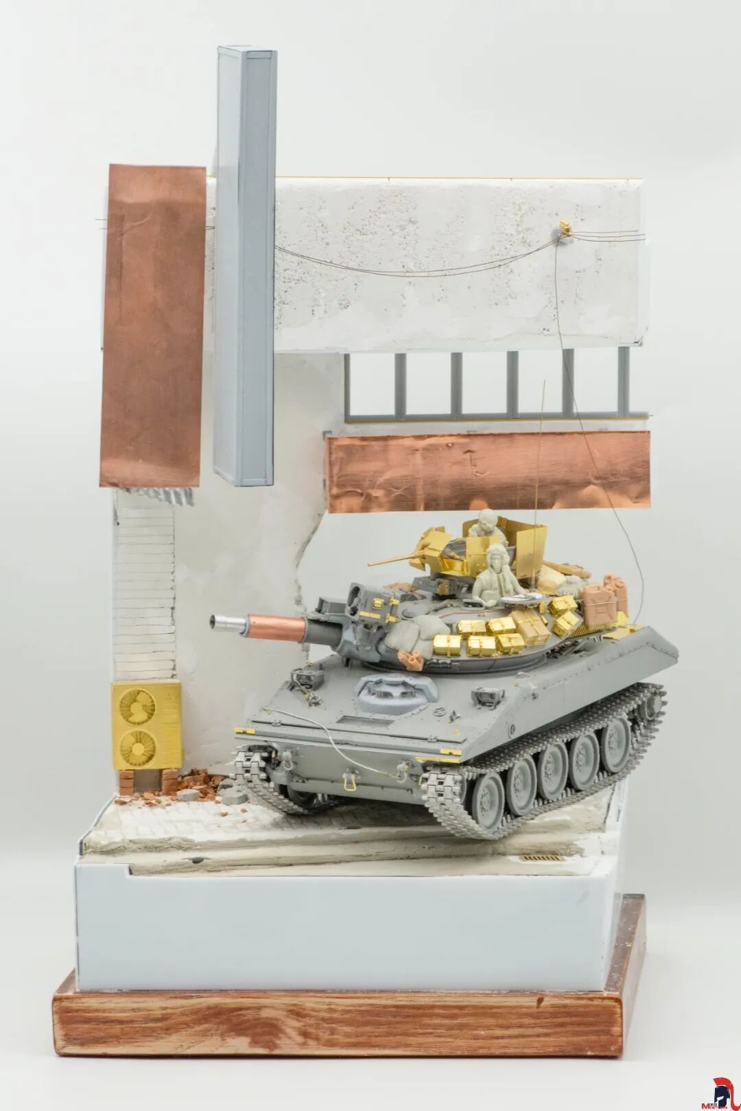 设定背景是1989年美军入侵巴拿马时的M551,像是前期和后期的混合形态,车体配件上既能看到前期型号的东西,也能发现后期91年海湾战争时期的设备。利用了一点田宫的美军包裹,尾栏载物用AB补土捏制。