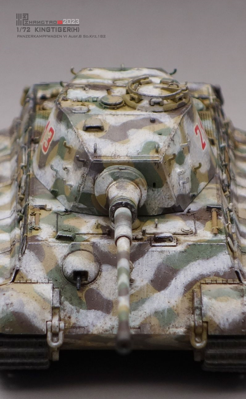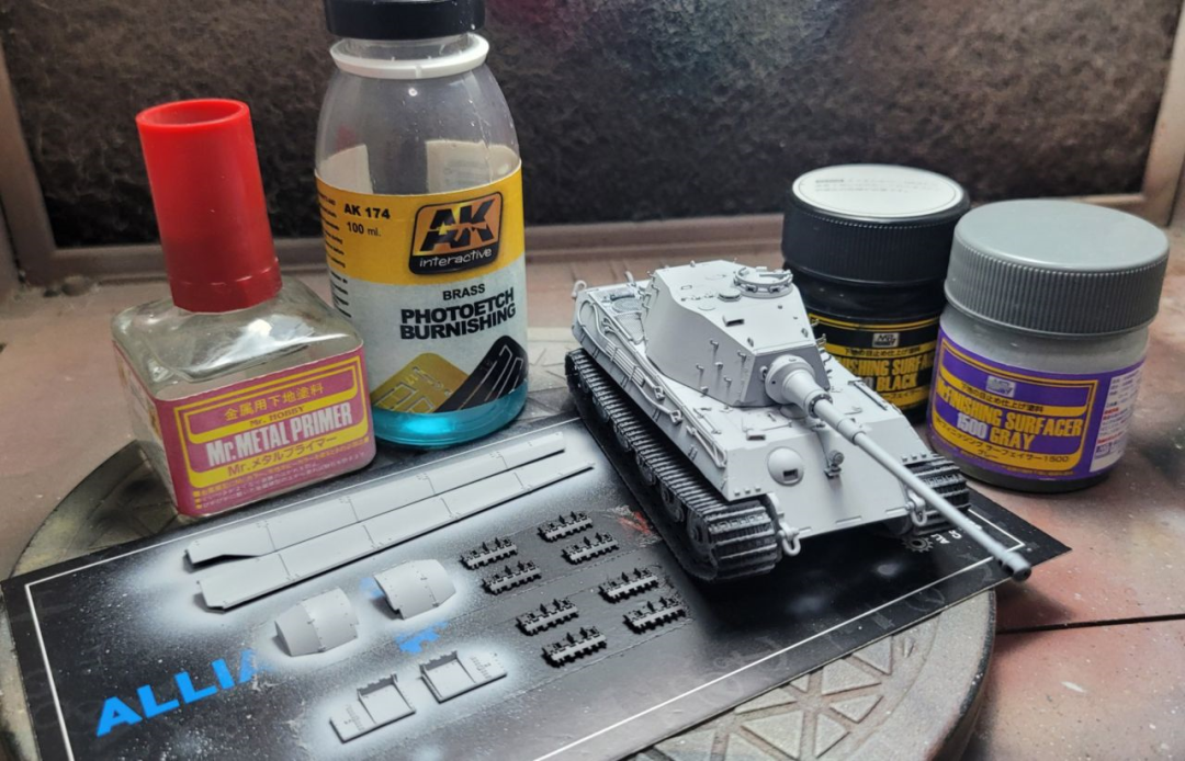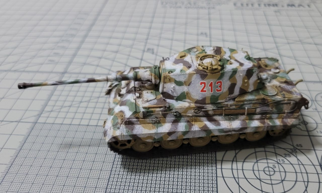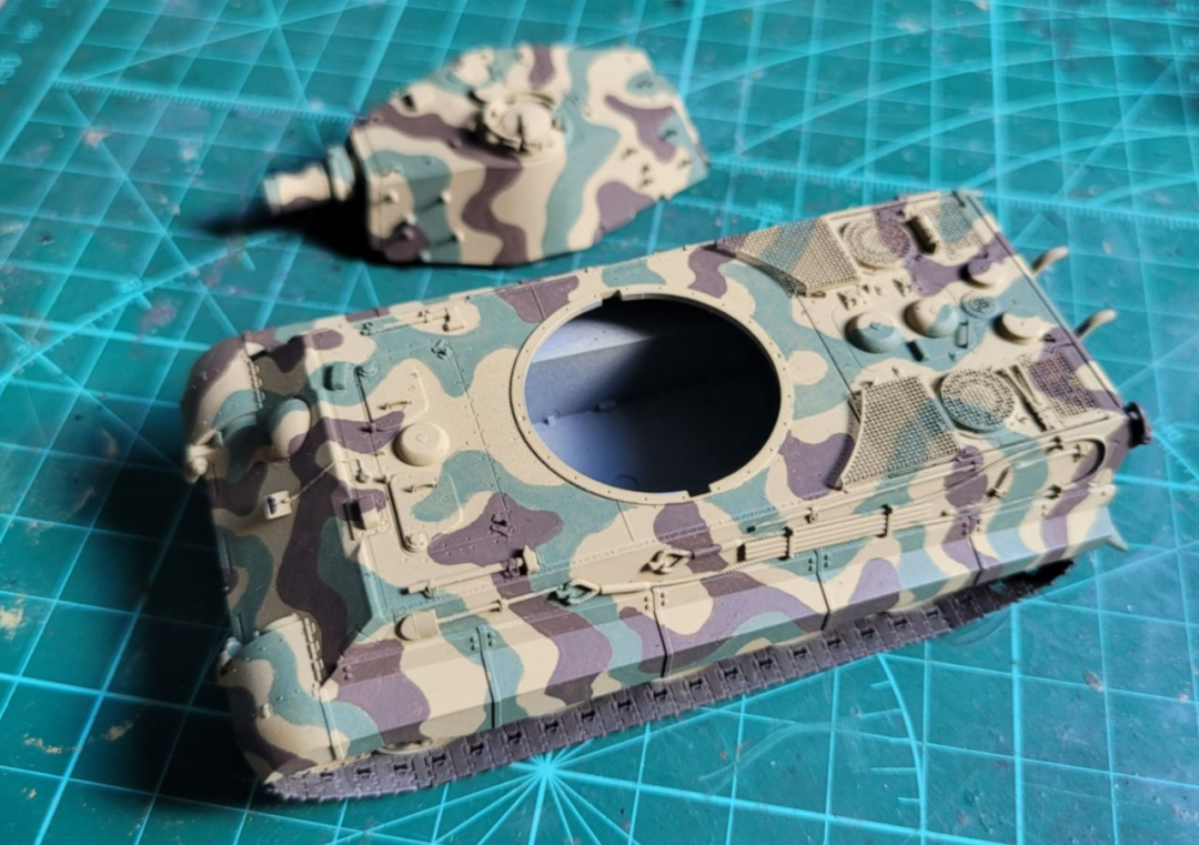 代工原因所以底漆尽量结实些(蚀刻片发黑处理+郡仕金属底漆+郡仕油性补土+完成后硝基透明漆保护),底色田宫漆(德军黄XF60提亮)加笔涂AV水性漆,因为采购方对白色迷彩图案有要求,绿棕图案须考虑白色迷彩图案,说白了形成迷彩条纹角度交叉才好看。