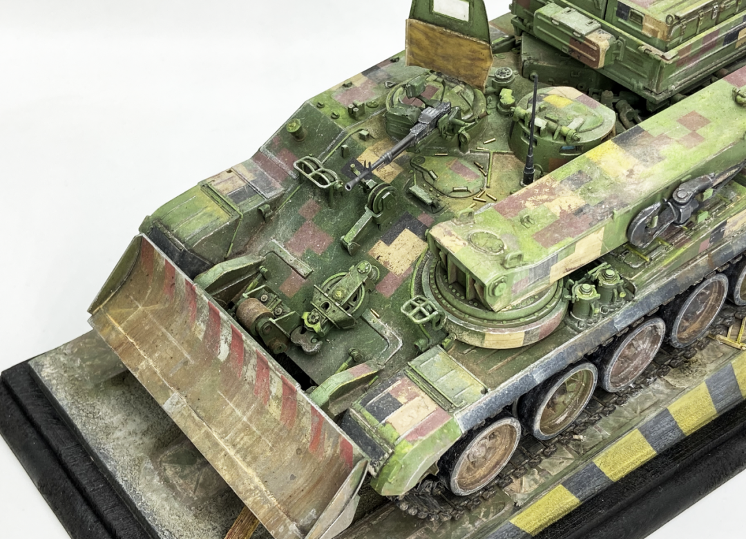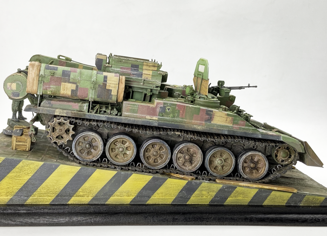 这个倾斜的地台配上警示标识实在是太有感觉了!siang师傅还给配了个小兵人,地台的面也是有花纹效果,虽然地台不大,但该有的细节一点不少。再说车辆本身,车身的泥土配上一些位置的剐蹭效果,实在是太真是迷人了。前方推土铲的制作也非常亮眼,战车整体的效果特别统一,该怎么评价呢,这就是用心的作品啊!