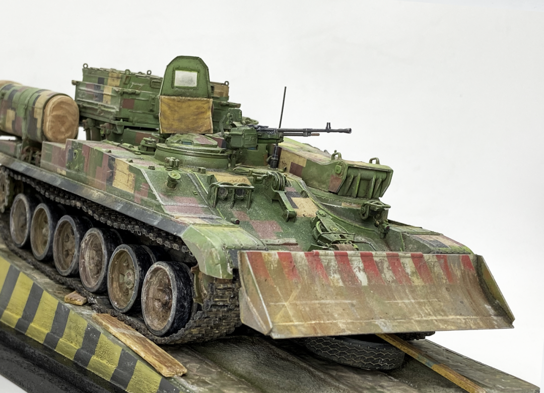 这件作品所用的板件是小号手 1/35 09554 俄罗斯BREM-1M装甲抢修车,添加了沃雅 PEA203 T72指挥塔防破片盾以及NSVT 12.7mm机枪等改件。