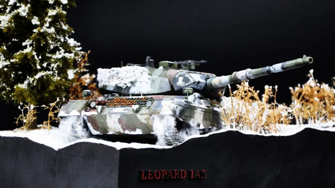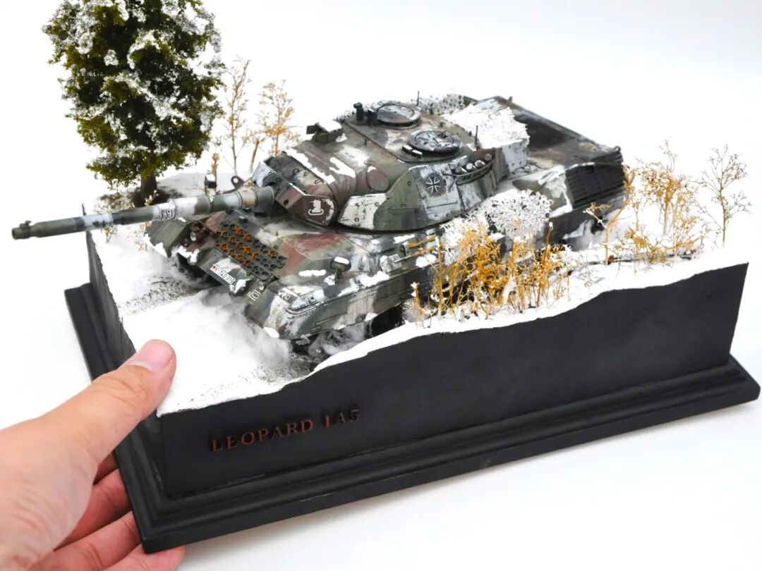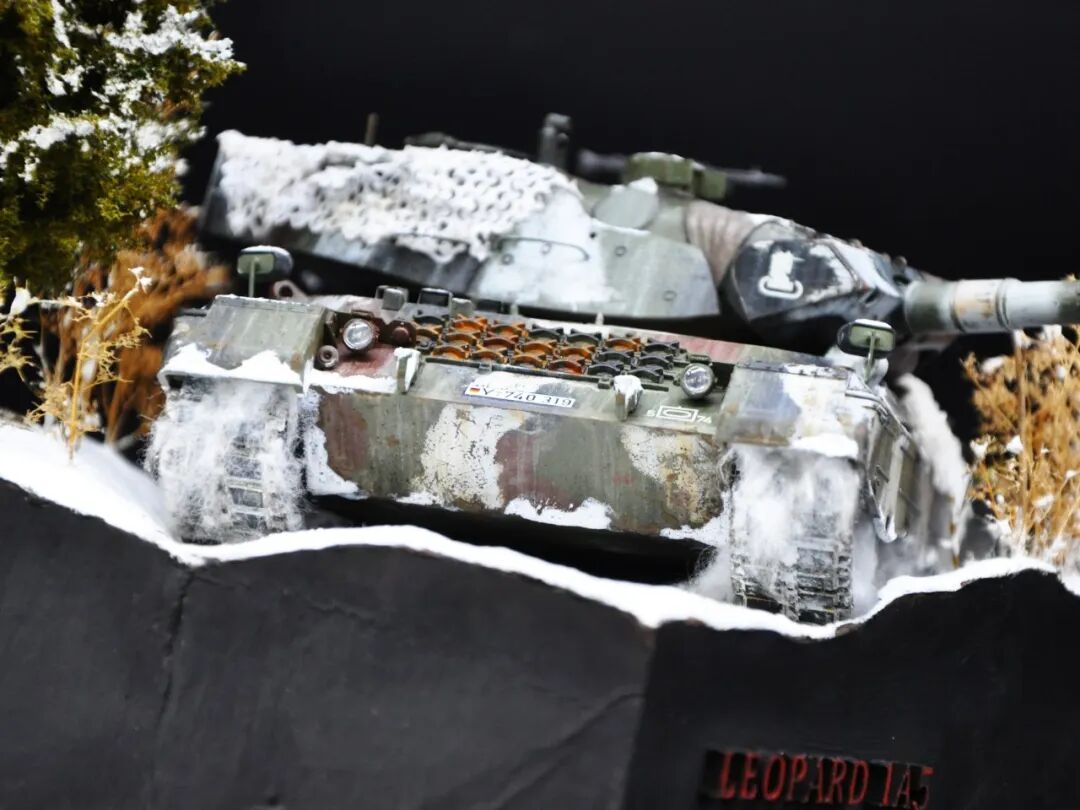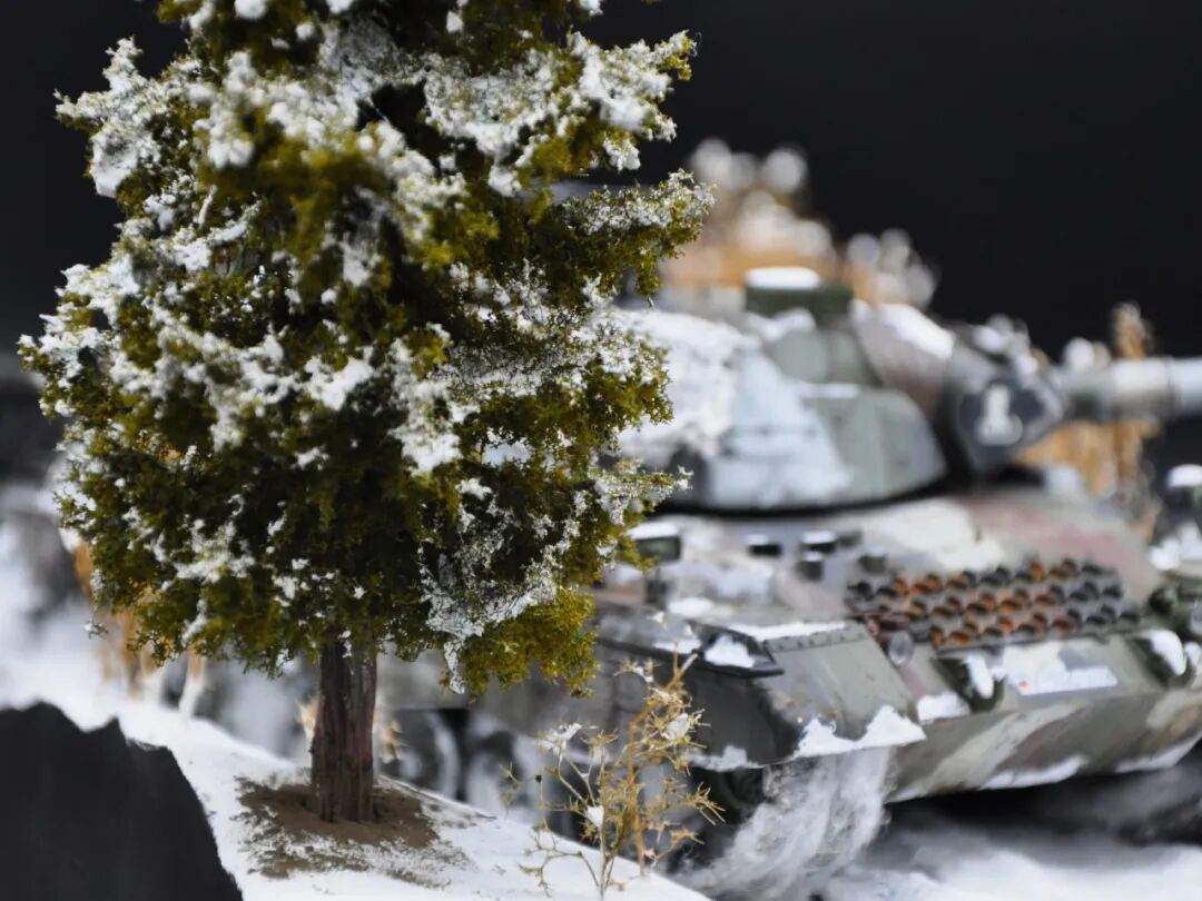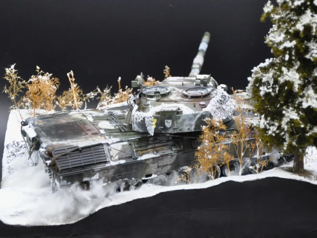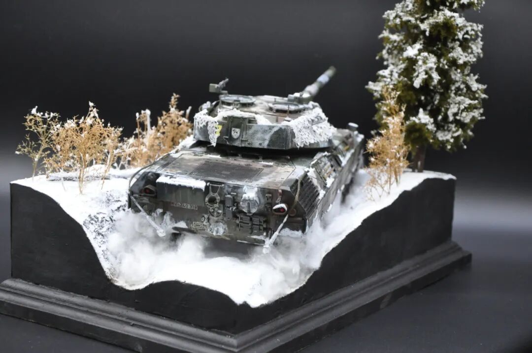德国的豹1系列坦克舍弃了厚重的装甲换取了优秀的机动性,因此本次制作想展示“坦克冲出雪地”的动态效果,使用了棉花来表现履带扬起的雪花。