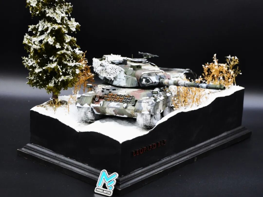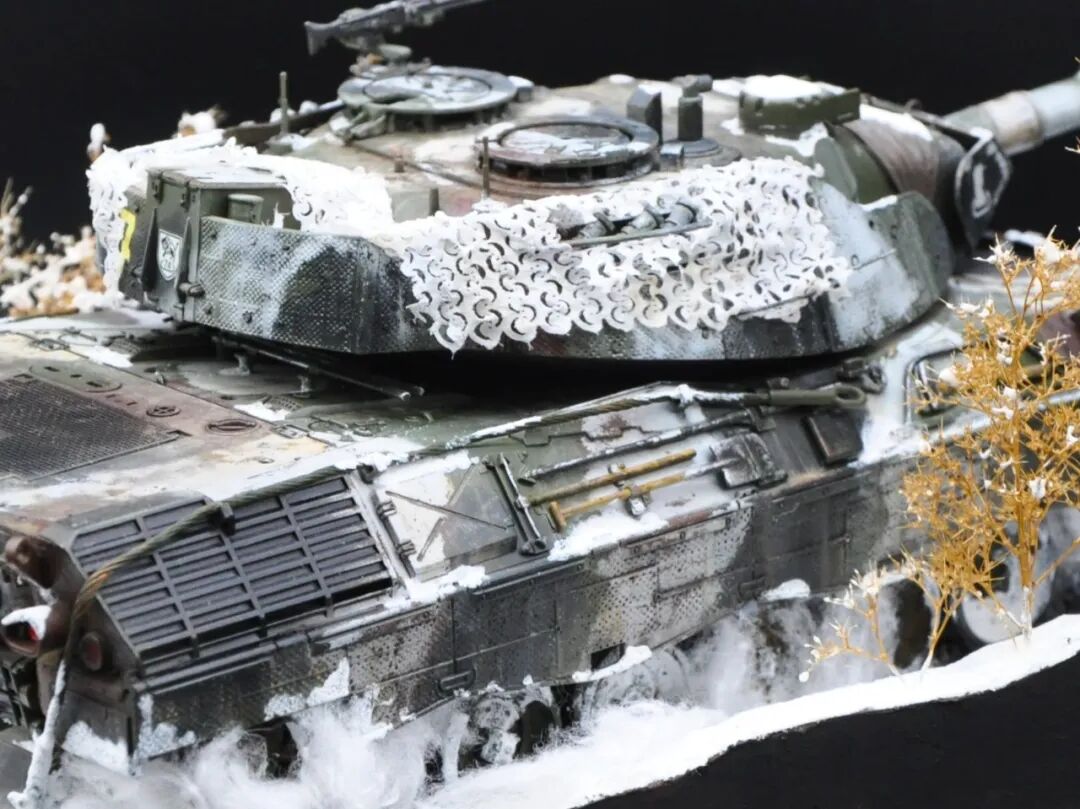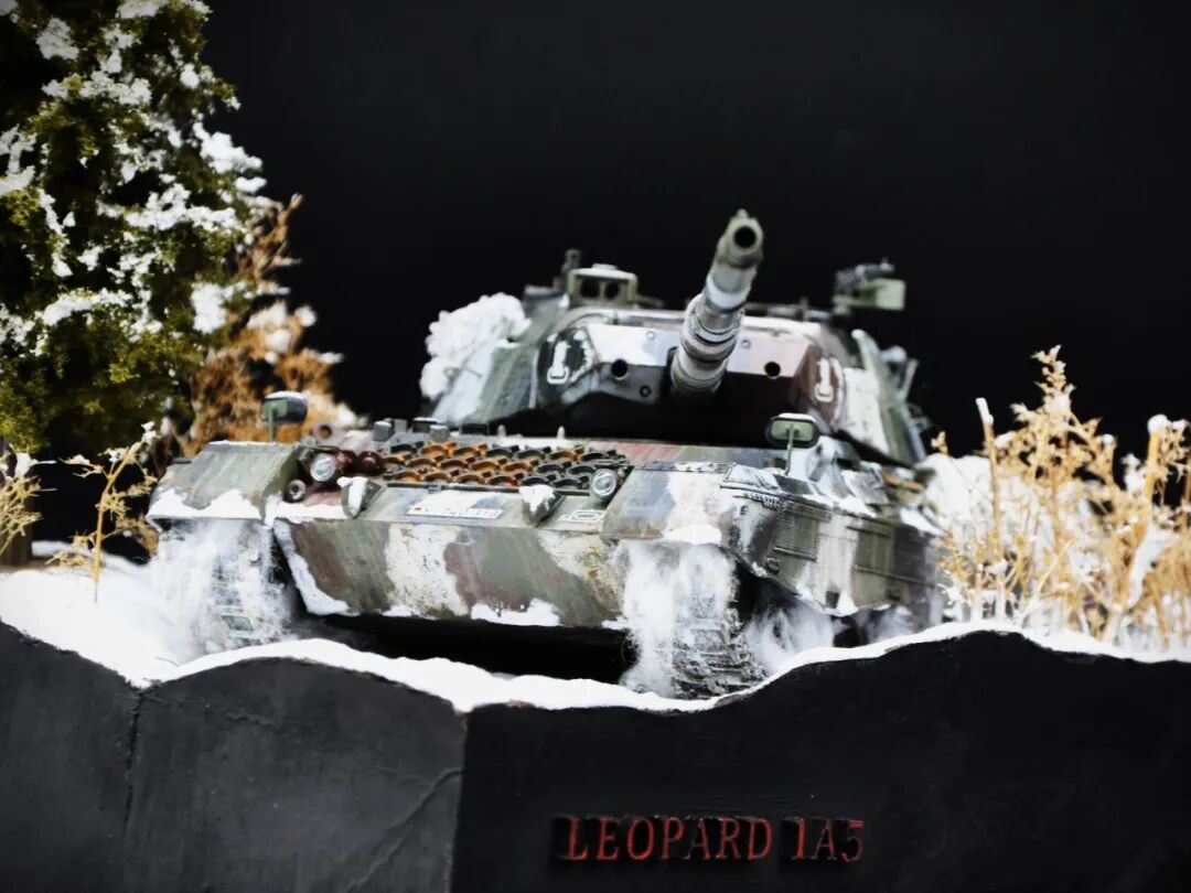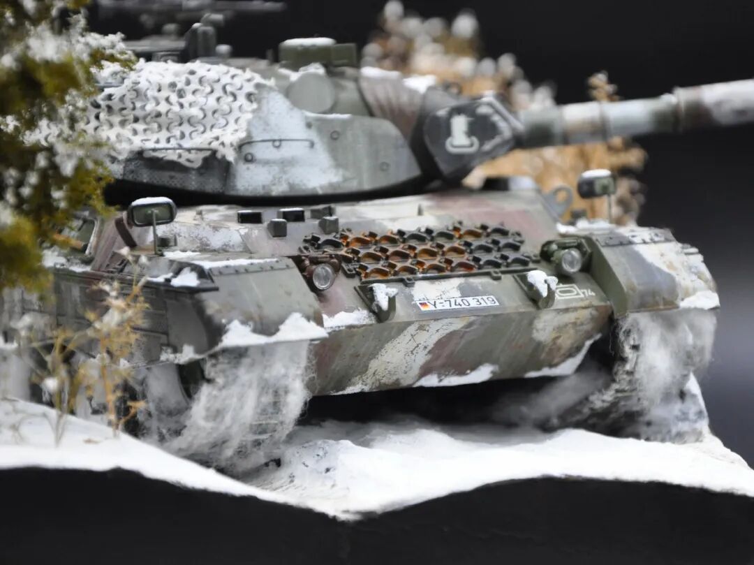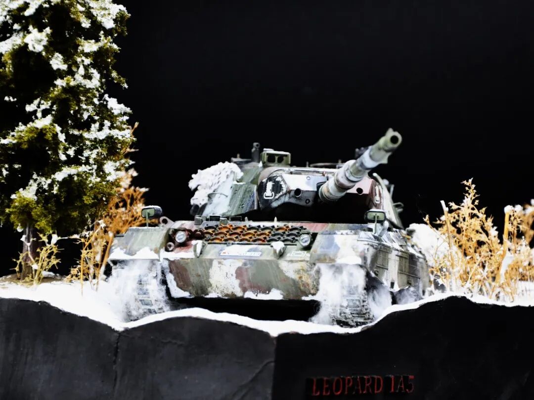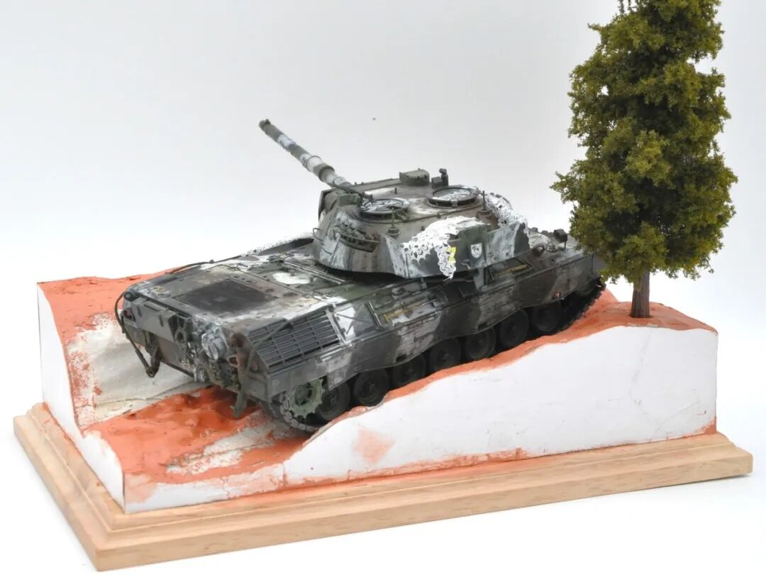 德国的豹1系列坦克舍弃了厚重的装甲换取了优秀的机动性,因此本次制作想展示“坦克冲出雪地”的动态效果,使用了棉花来表现履带扬起的雪花。