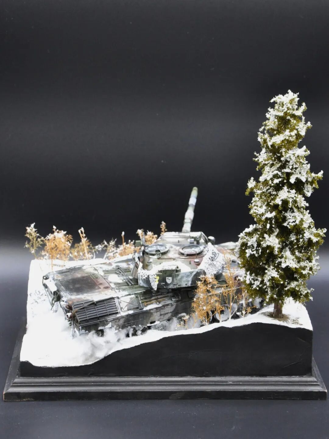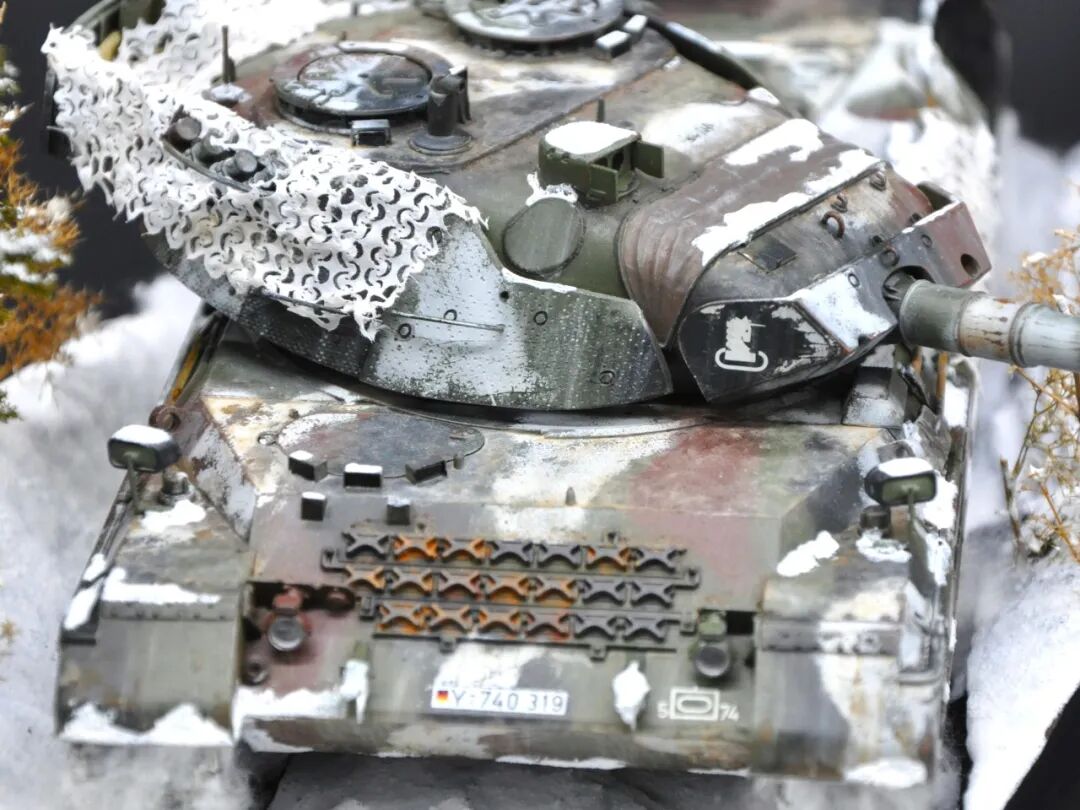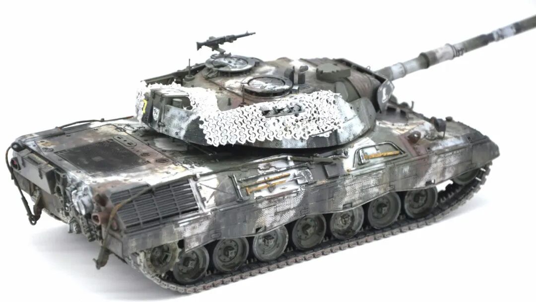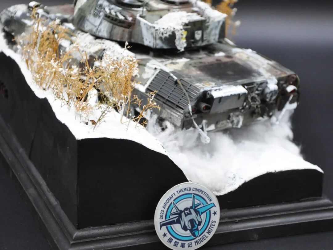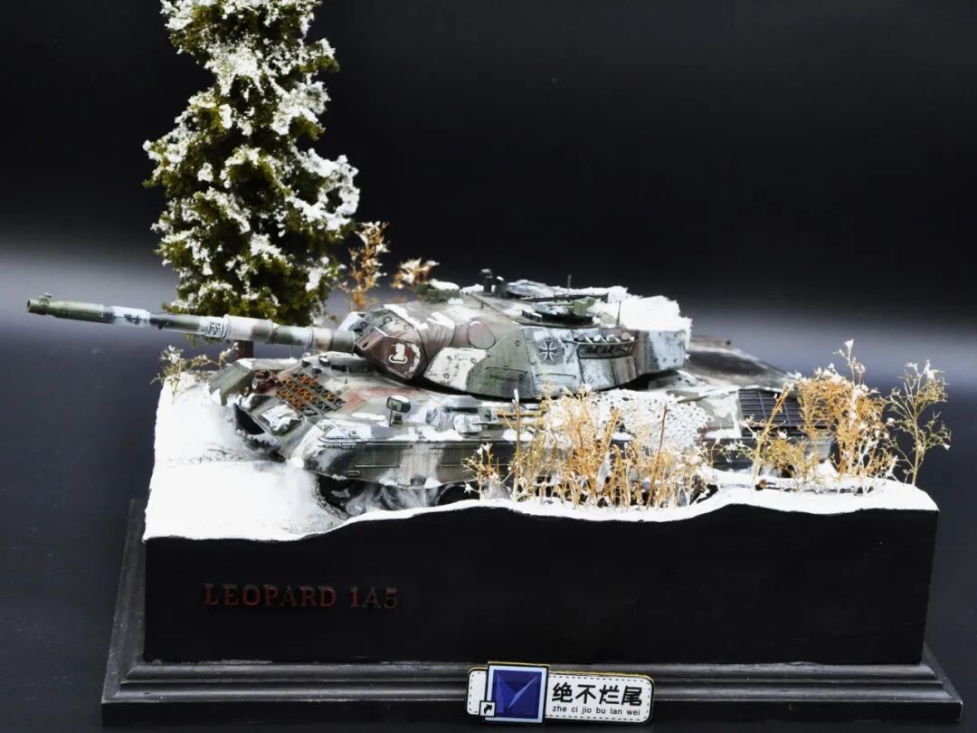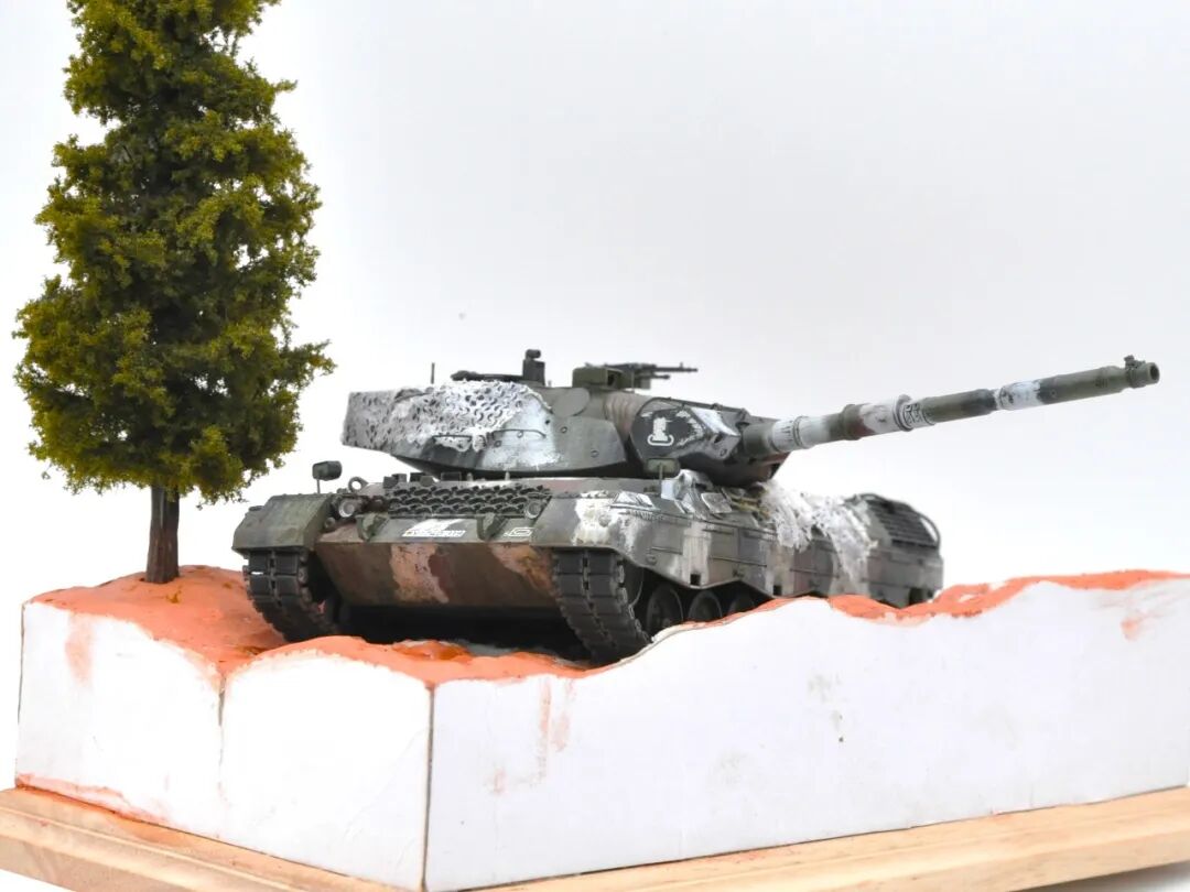 德国的豹1系列坦克舍弃了厚重的装甲换取了优秀的机动性,因此本次制作想展示“坦克冲出雪地”的动态效果,使用了棉花来表现履带扬起的雪花。